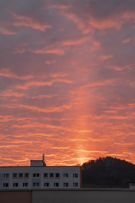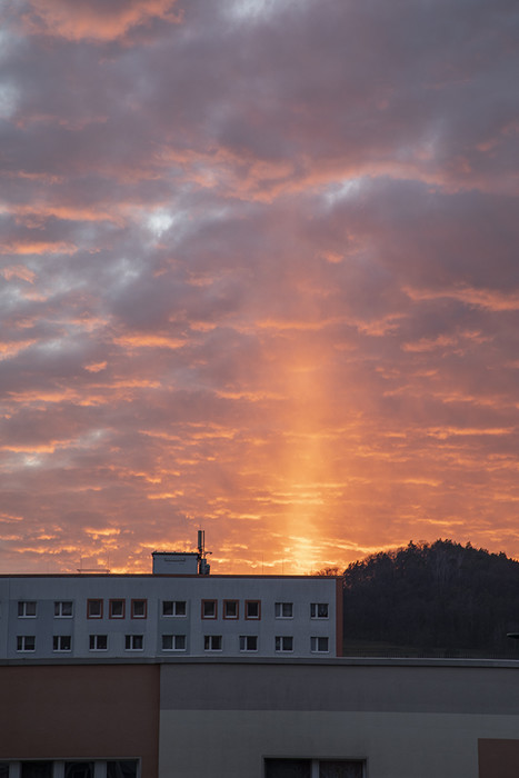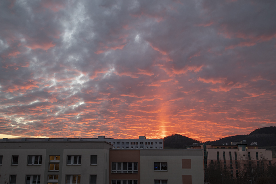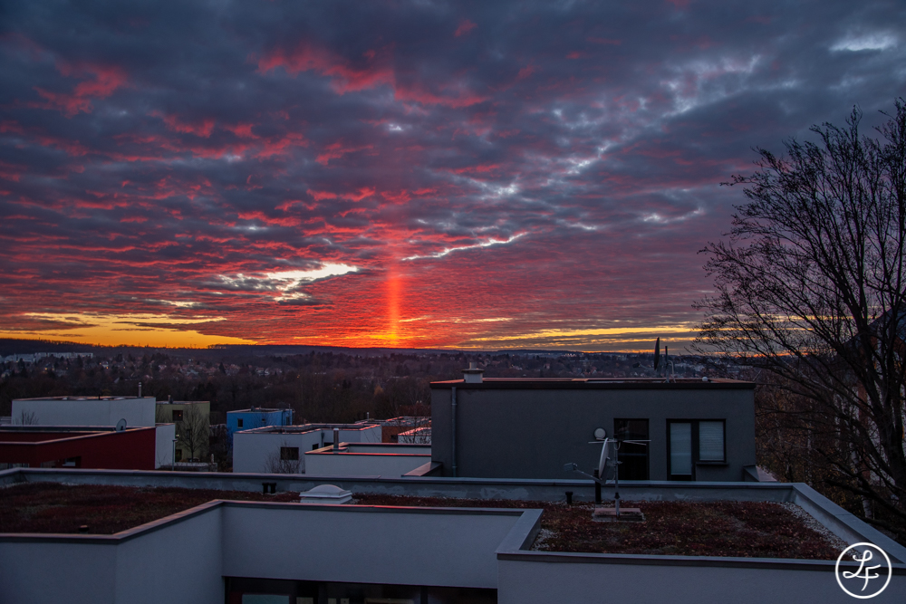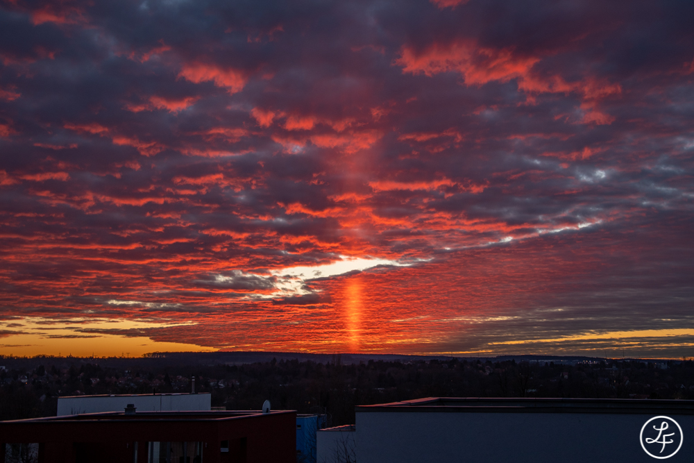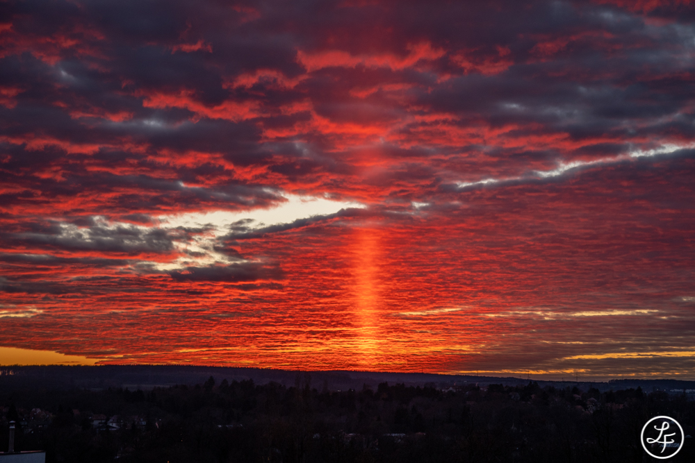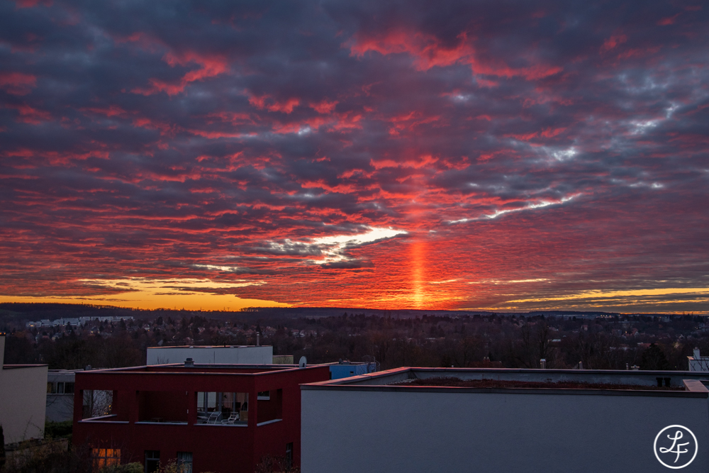 von Weimar aus war die Obere Lichtsäule auch sehr gut zu sehen. Ich hab sie glücklicherweise durch Zufall entdeckt und bin gleich auf den Balkon gestürmt. Je länger die Lichtsäule anhielt, umso intensiver wurde sie und auch das umgebene Abendrot leuchtete immer mehr.