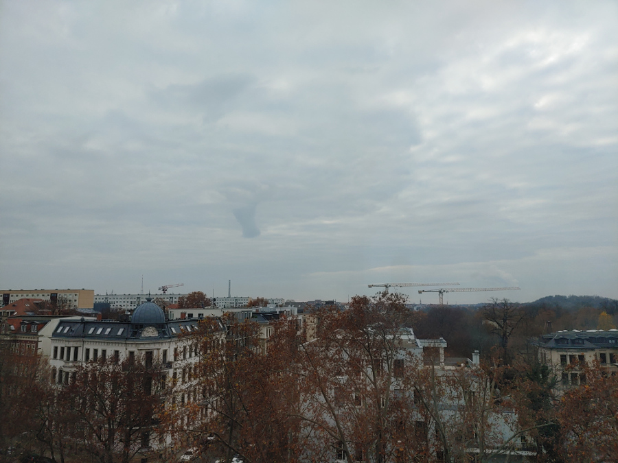 Dieses Gebilde konnte ich kurz nach 10 Uhr fotografieren, wobei es zunächst den Anschein erweckte, die Verlängerung des Wasserdampfschlotes aus dem Kraftwerk Lippendorf zu sein, der aber in der Mitte unterbrochen schien. Die konzentrischen Kreise in der Stratocumulus-Wolkendecke verraten, dass es sich hier tatsächlich um etwas Eingedrehtes handelte, wobei ich (zumindest mit bloßem Auge) keine Rotation feststellen konnte. Es war auch die einzige Absenkung, die ich weit und breit entdecken konnte.