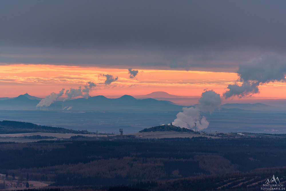 Am Osthorizont gab es noch eine schmale Wolkenlücke, die Sonne war aber schon aufgegangen, als ich oben ankam. Die Lichtstimmung mit dem etwa 60km entfernten böhmischen Mittelgebirge war aber doch sehenswert (im Vordergrund der Kupferhübel):