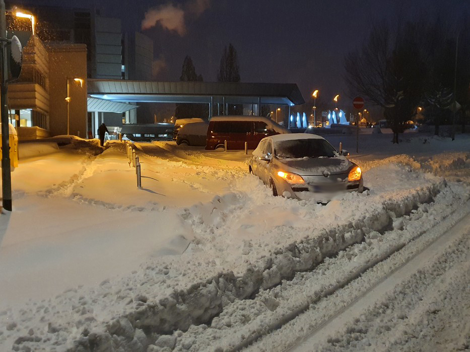 Am Klinikum standen in der Einfahrt zum Mitarbeiterparkplatz und vor dem Haupteingang verlassene festgefahrene Autos.