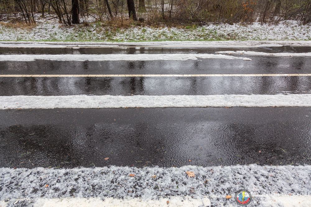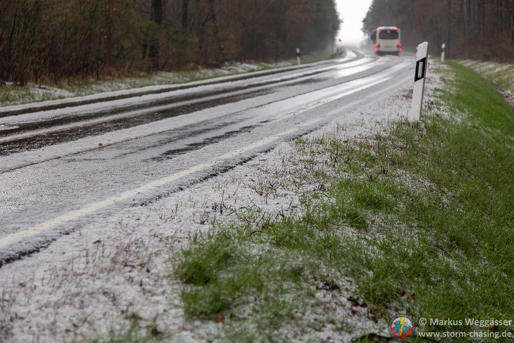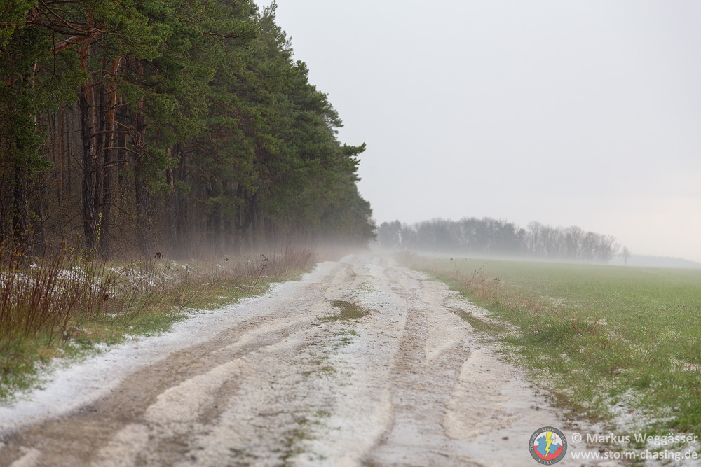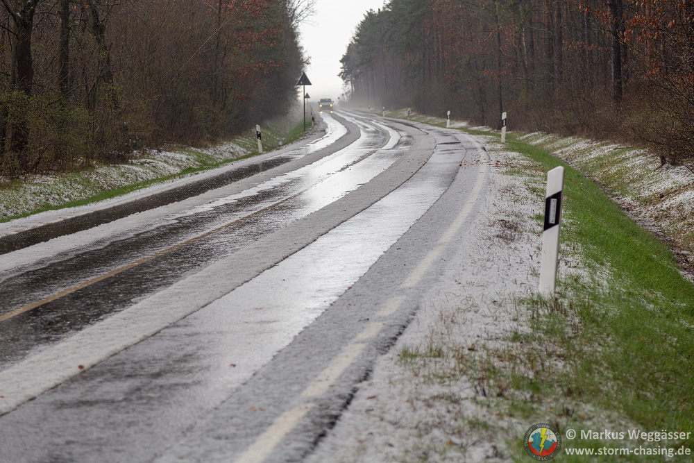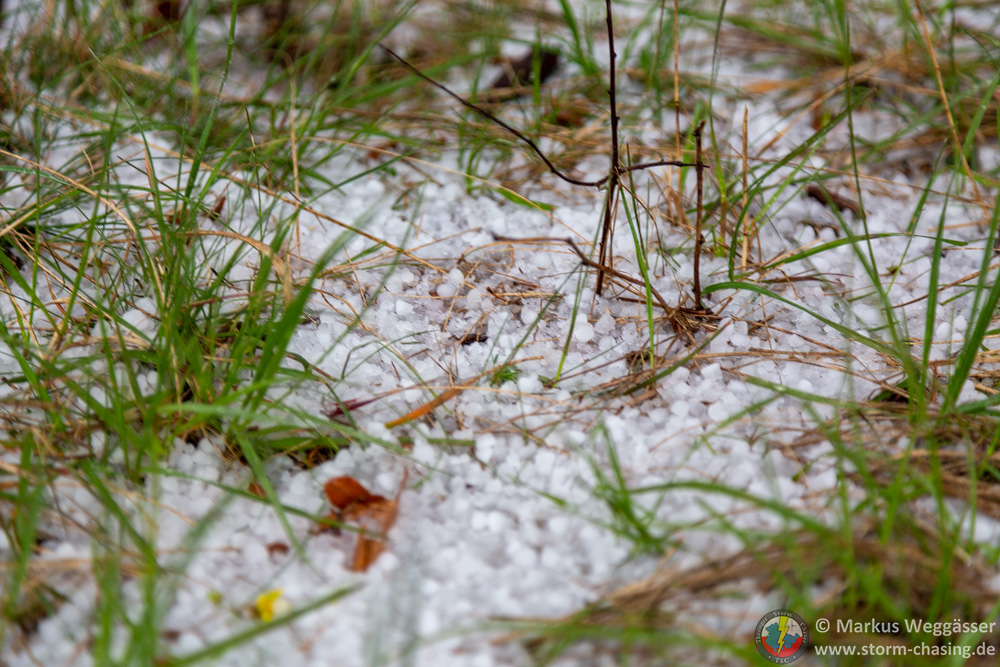 Von dort aus fuhren wir der Zelle noch über Marlishausen hinterher. Auf der Landstraße zwischen Marlishausen und Hohes Kreuz hat es auf einem kleinen Teilstück eine fast geschlossene Decke aus Graupel und kleinem Hagel gegeben. Felix meldete aus Marlishausen bereits Körner um 1cm.