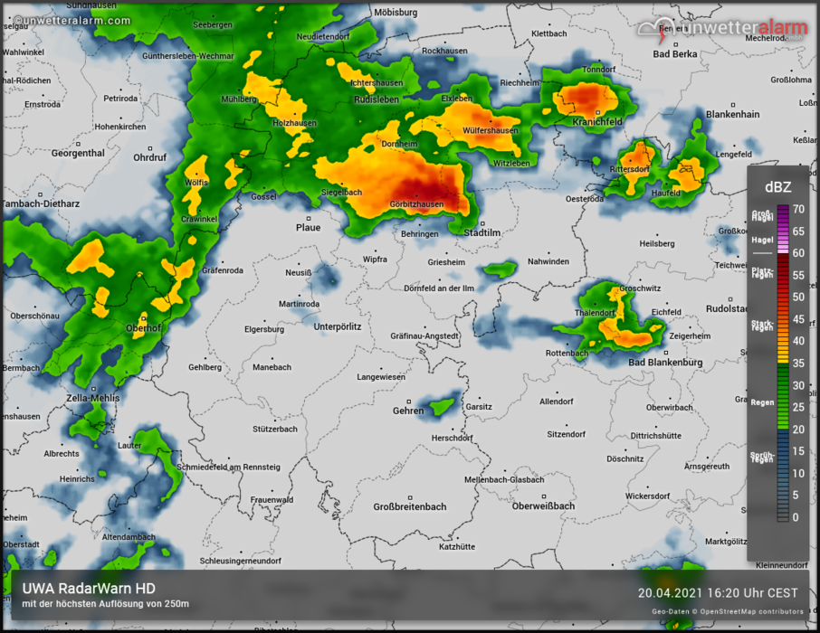 Auf recht seltener Zugbahn zogen heute Nachmittag Schauer- und Gewitterzellen von Norden nach Süden über Thüringen. Dem Outflow folgend bildeten sich um die ersten Zellen immer wieder links und rechts neue Zellen, die später einen Coldpool im Norden hinterließen.