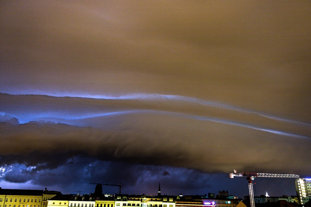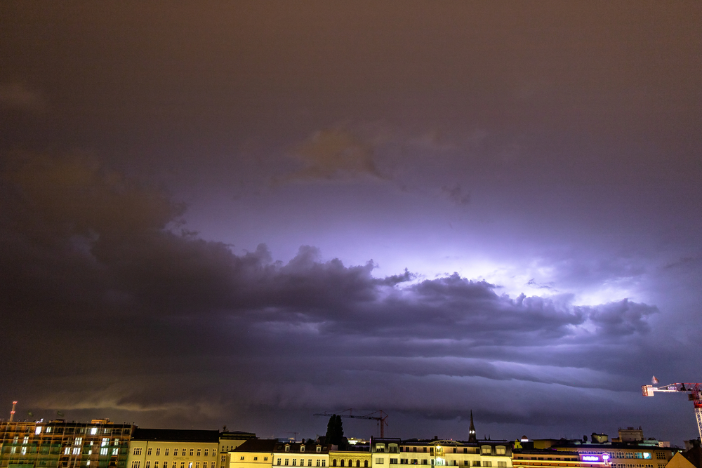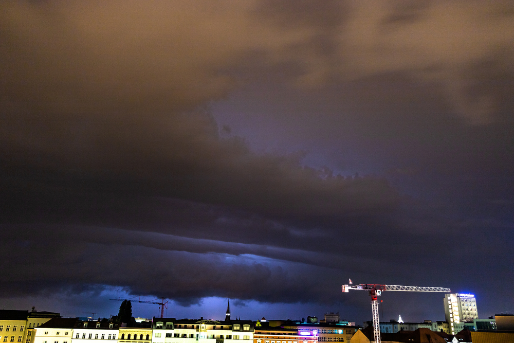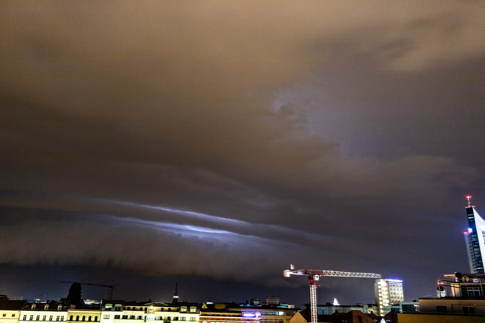 Das zweite anständige Gewitter in Leipzig kam erneut während der Dunkelheit, wie schon am 13.01. Ein MCS mit eingebauten Bowsegmenten arbeitete sich in den späten Abend und Nachtstunden von Bayern über Thüringen nach Westsachsen vor. Ich hatte mir es mit einem Bier auf dem Balkon mit BLick nach Südwest gemütlich gemacht und konnte gegen 1 Uhr erstes Wetterleuchten sehen. Gegen 2 Uhr war die Linie dann da und präsentierte sich mit einer gigantischen Shelf und einen kurzen Downburst nachfolgenden. Die Blitzferquenz ließ dann aber bereits deutlich nach. Aber die Shelf wollte ich euch nicht vorenthalten.