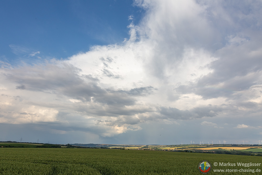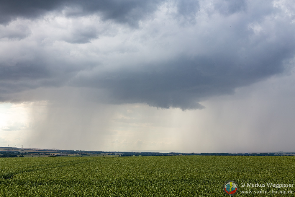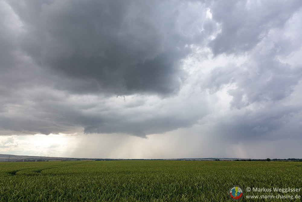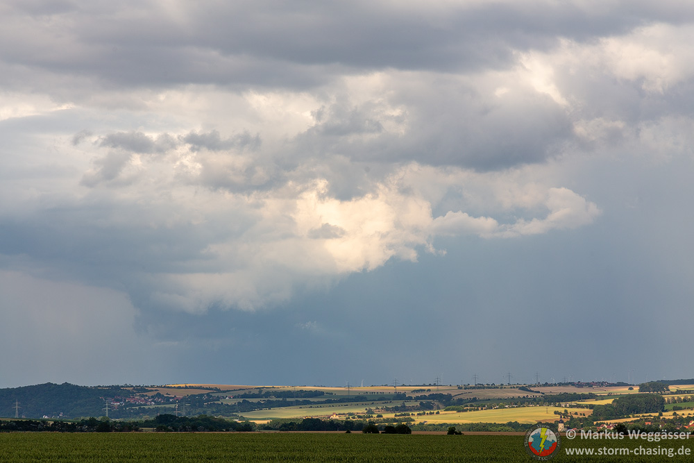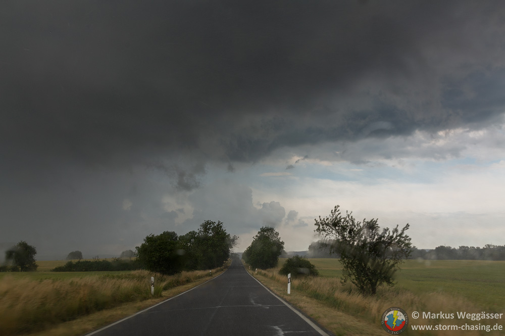 Diese schöne Struktur wollte ich gern noch weiter beobachten und suchte einen nahen Beobachtungspunkt auf einem Hügel. In Laucha waren jedoch gerade die Bahnschranken geschlossen und das nicht zu kurz. Die kurze Fahrt auf den Hügel danach zeigte nur, dass die Zelle in den knappen 10 Minuten ihre besten Momente hinter sich hatte und nun deutlich abwinddominant war. Struktur weg.