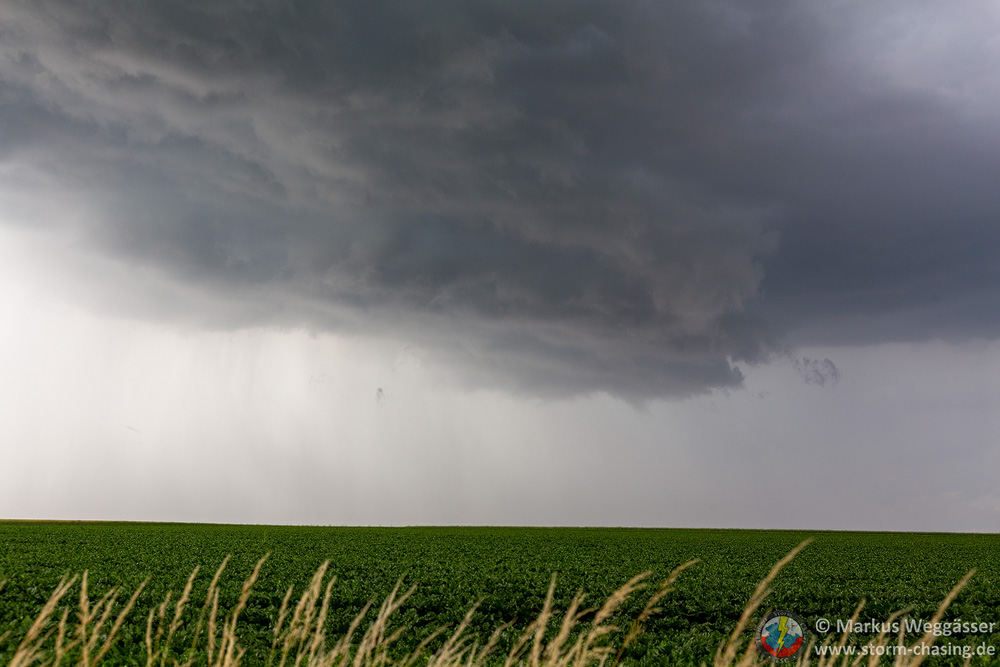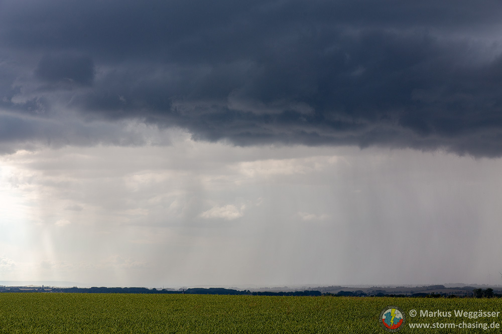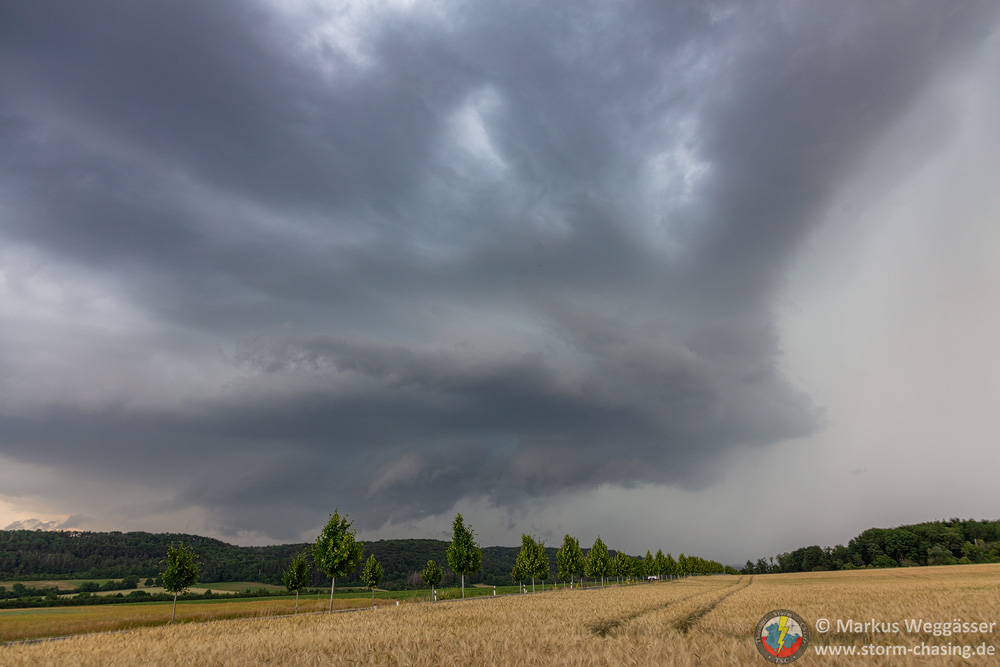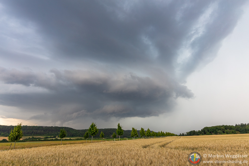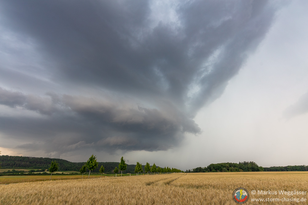 Diese schöne Struktur wollte ich gern noch weiter beobachten und suchte einen nahen Beobachtungspunkt auf einem Hügel. In Laucha waren jedoch gerade die Bahnschranken geschlossen und das nicht zu kurz. Die kurze Fahrt auf den Hügel danach zeigte nur, dass die Zelle in den knappen 10 Minuten ihre besten Momente hinter sich hatte und nun deutlich abwinddominant war. Struktur weg.