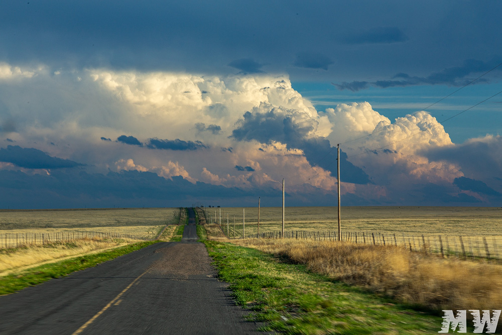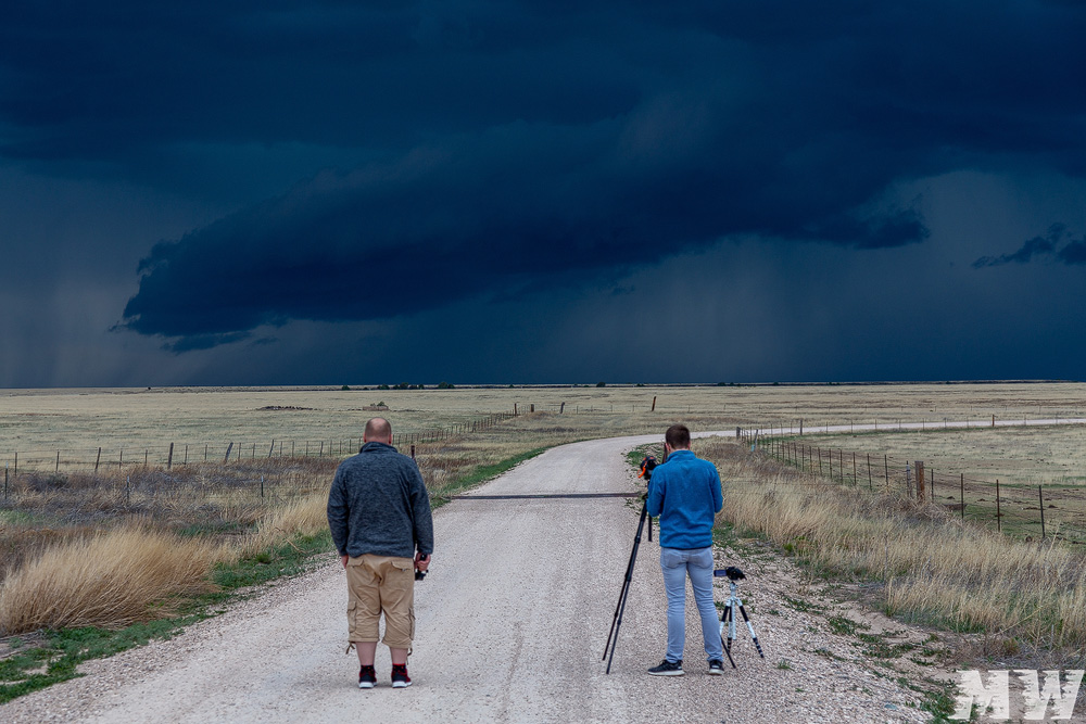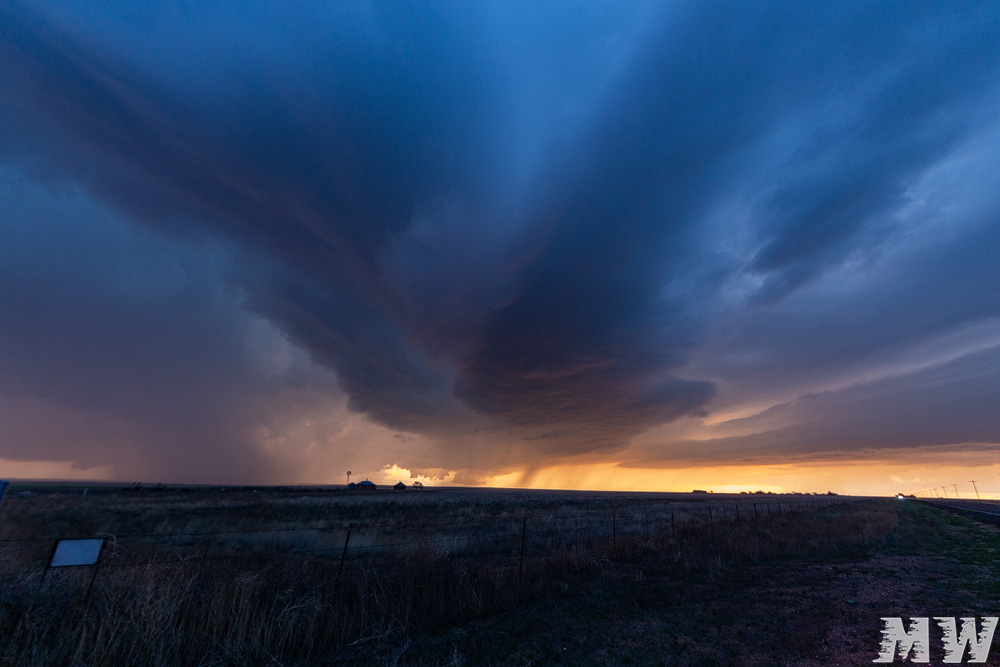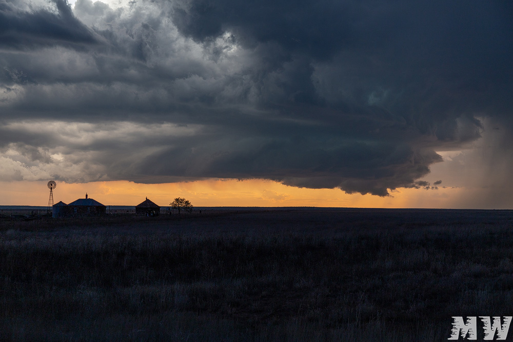 Die südliche Zelle, die auf den Ort Roy zuzog, hatte das andere Team bereits angefahren. Wir kamen von Norden dazu und trafen schließlich aufeinander. Das Spektakel aus Abendlicht, Blitzen und der rotierenden Zelle genossen wir gemeinsam. Passend dazu meine geliebten Plains-Windmühlen ![]()