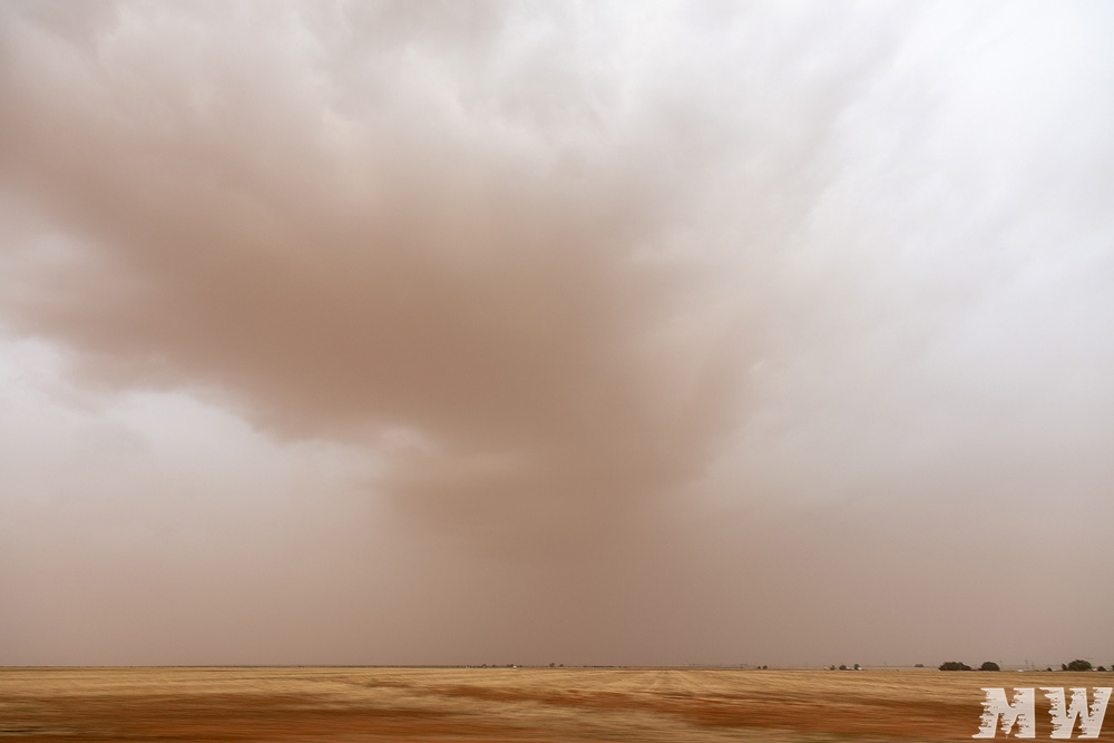 Wir steuern als Ausgangsposition Melrose an. Und sind damit auch nicht allein. Viele Chaser treffen wir hier an der Tankstelle wieder. Was wir auch schnell merken, ist eine merkwürdig orangegefärbte Atmosphäre. Ein größerer Brand ist es nicht, sondern große Mengen aufgewirbelten Staubs. Das ist schlecht für die Sicht, aber gut für neue Eindrücke, die wir so noch nicht kannten.