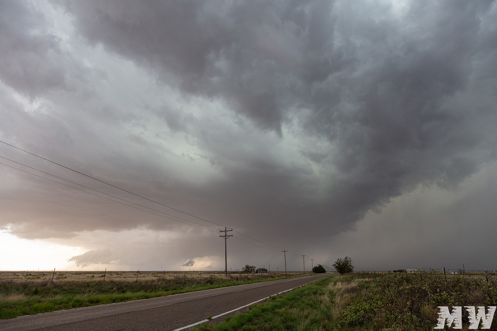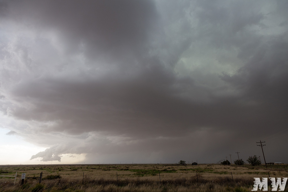 Eine Superzelle nördlich von Roswell hat unsere Aufmerksamkeit. Wir fahren sie nach Süden hin an. Ob wir was sehen werden? Im Radio läuft derweil die Tornadowarnung. Als wir näherkommen, ist auch endlich in der Ferne wieder Struktur sichtbar. Wir finden einen geeigneten Haltepunkt und können sie beobachten: