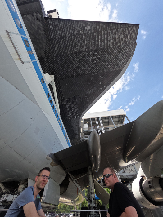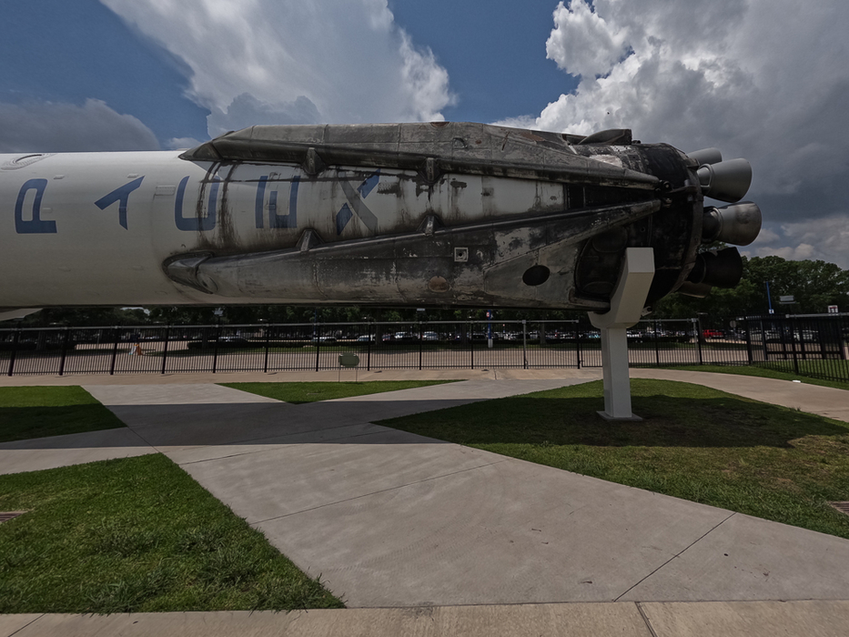 Direkt am Eingang sahen wir das international bekannte Shuttle Carrier Aircraft (SCA) – die Space Shuttle Replik ‚Independence‘ im Huckepack einer Boing 747-100. Das Innenleben wurde zu Ausstellungsräumen ausgebaut. Unweit davon liefen wir zu einer gebrauchten Falcon 9 von Space X, die mit ihrer spektakulären Rückkehr und Landung in Florida jüngst Geschichte schrieb.