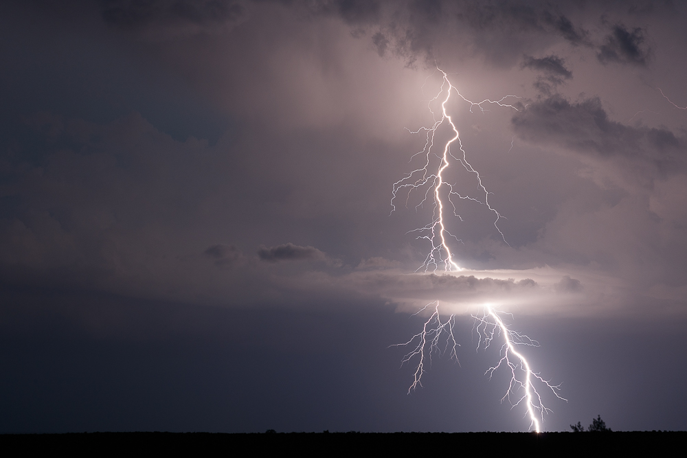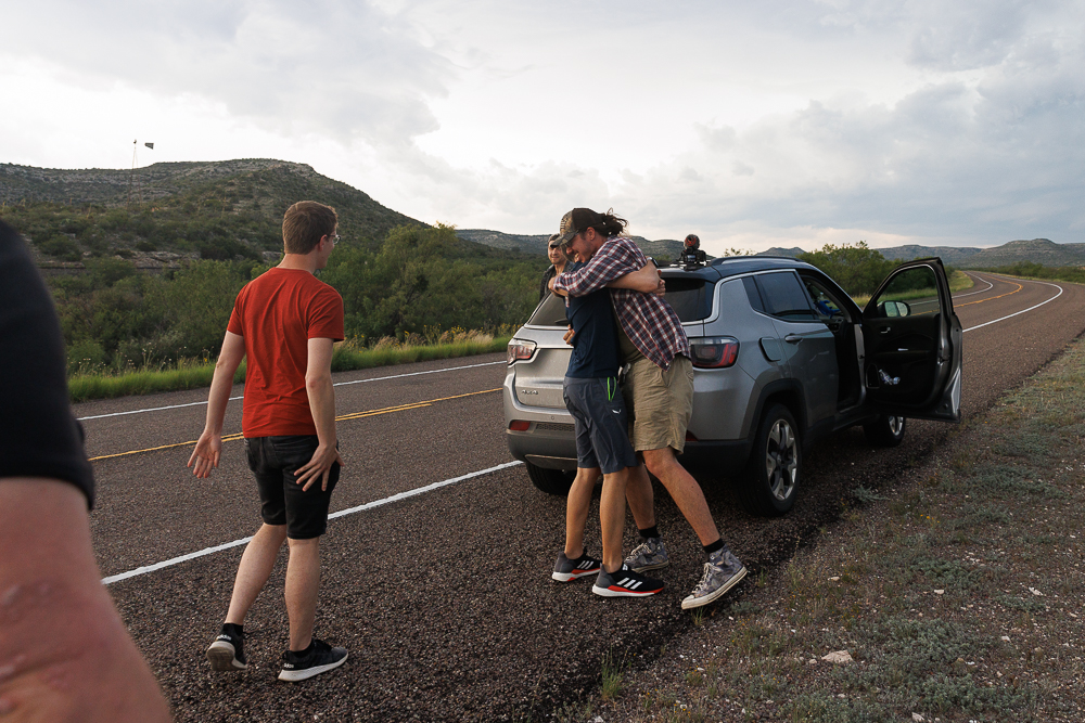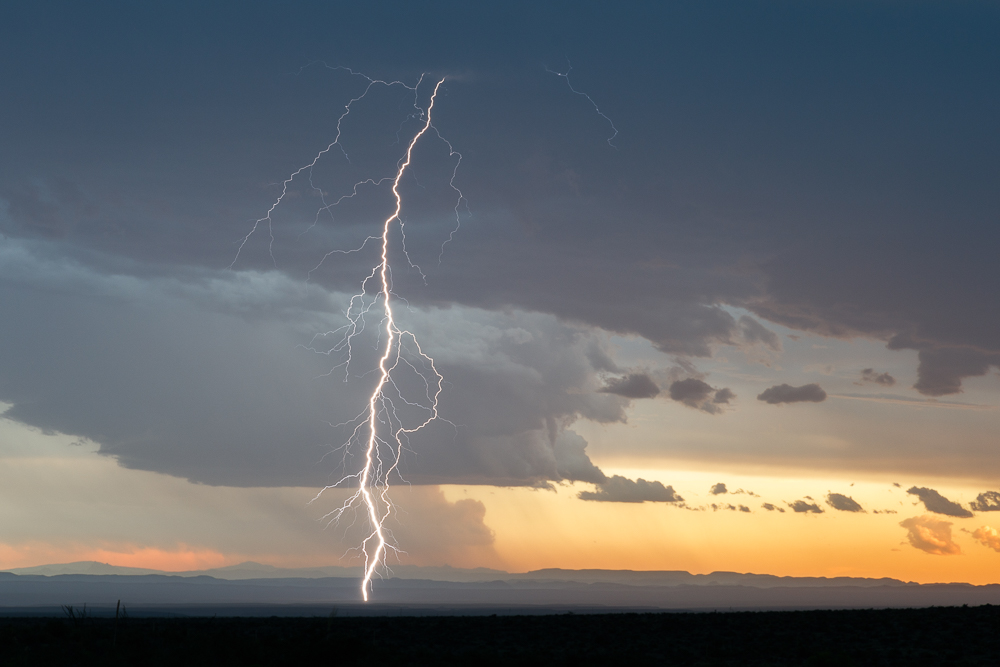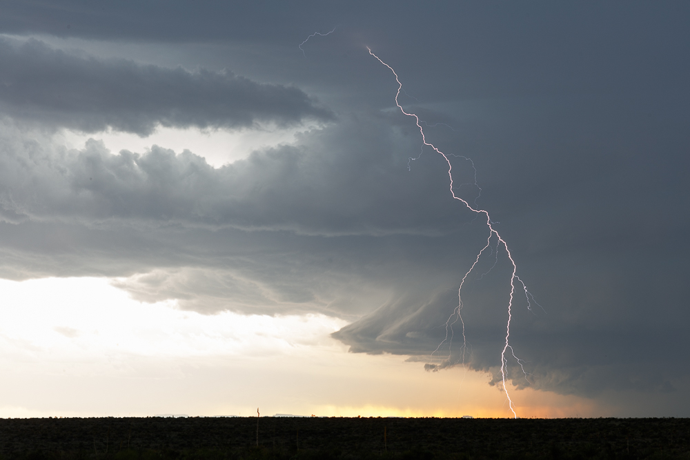 Wir fuhren über Sanderson, wo wir bereits getankt hatten, weiter nach Südosten, um ein zweites Mal einen guten Blick auf die Basis zu erhalten. Da man hier in der Regel durch Täler fährt, ist ein erhöhter Standort auf der Ebene gar nicht so einfach zu finden. Doch es gelang uns zum rechten Zeitpunkt. Die Zelle nahm blitztechnisch noch einmal Fahrt auf und unzählige Erdblitze schlugen in verschiedenen Himmelsrichtungen ein. Besonders schön waren die Entladungen, die sich Richtung Mexico im Licht des Sonnenuntergangs zeigten.