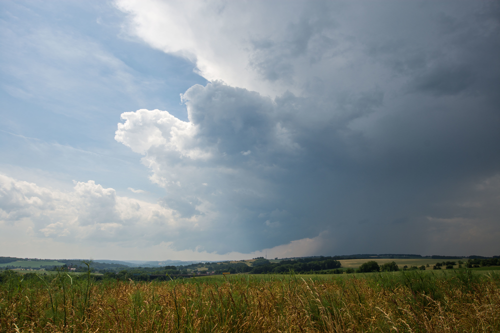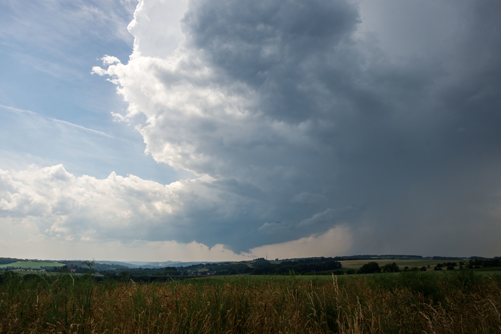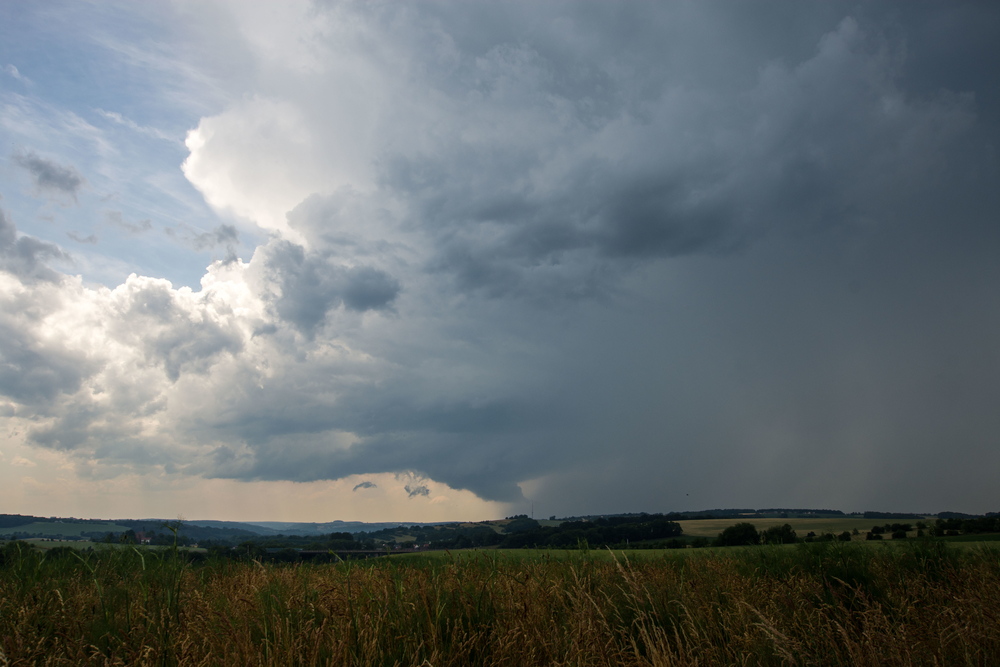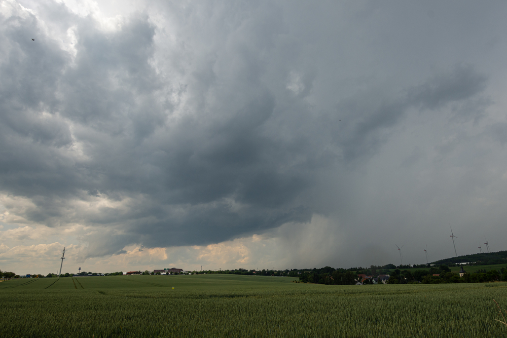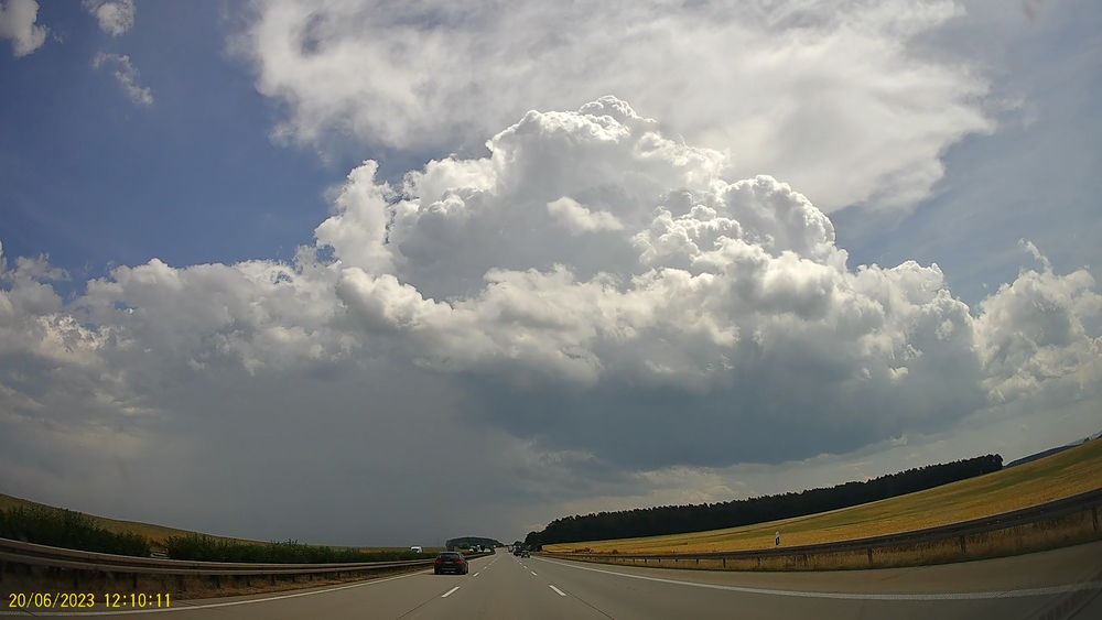 Dieser Entwicklung ging auf Höhe von Schmölln allerdings schnell die puste aus, und während ich mich noch über die sogenannte Bundesstraße zurück durch Schmölln kämpfte entstand bei Jena eine weitere Zelle. Diese meinte es scheinbar ernst(er), denn der Eisschirm wirkte optisch deutlich kräftiger und die Quellung deutlich höher. Ich positionierte mich nahe Gera nördlich der A4 um die Zelle auf mich zuziehen zu lassen. Gegen 14:30 (https://kachelmannwetter.com/de/regenradar/…0620-1230z.html) konnte ich von meinem Standort aus eine Recht tiefe Wolkenbasis erkennen. Darüber bildete sich soeben ein neuer Aufwind aus. Das ganze sah recht gesund und vielversprechend aus, der Wind wehte mittlerweile mäßig aus NO direkt auf die Zelle zu. Ich vermute, dass eine zurückgebliebene Outflowboundary der ersten entstandenen Zelle den zusätzlichen "push" für diese zweite, stärkere Entwicklung lieferte.
