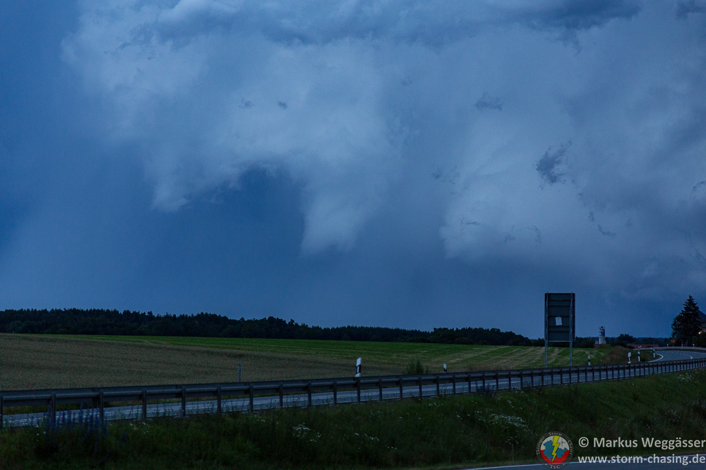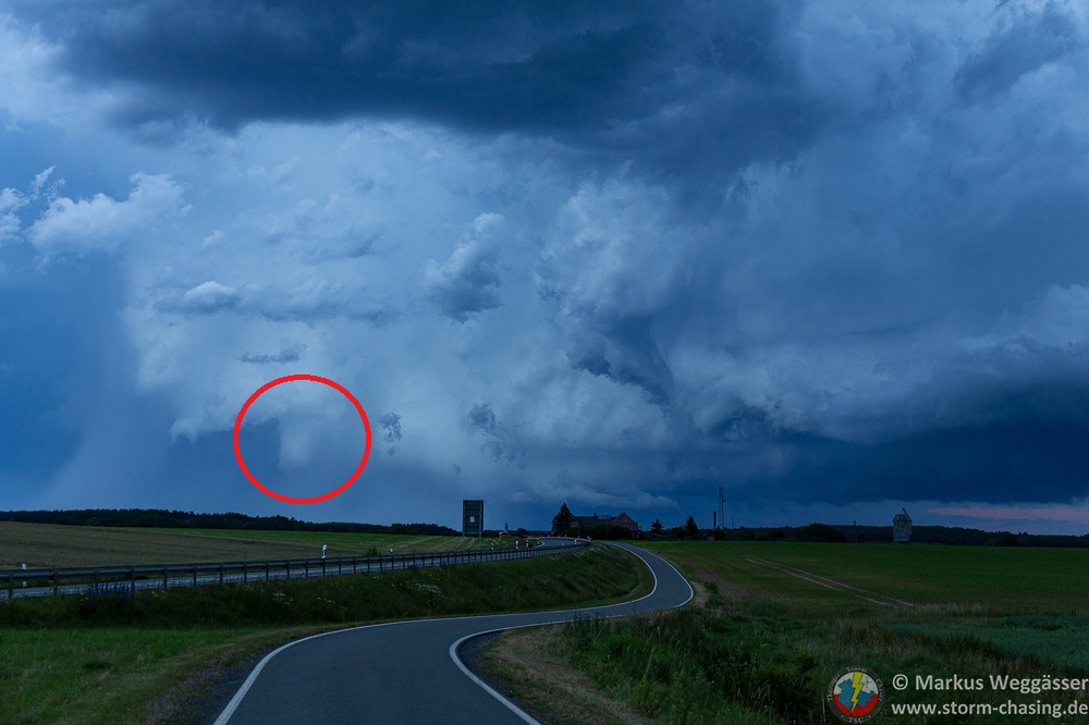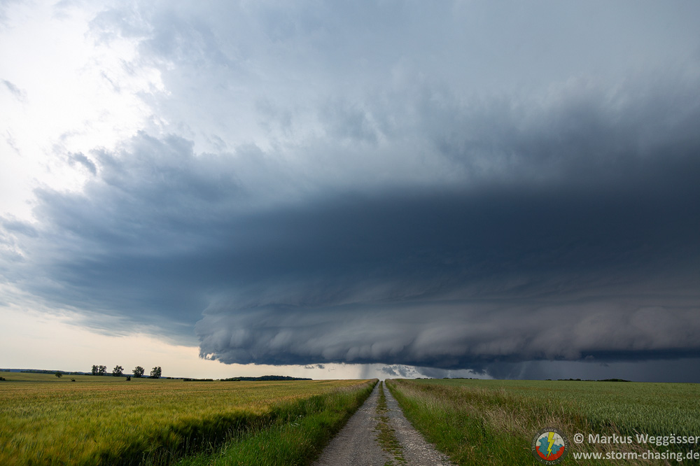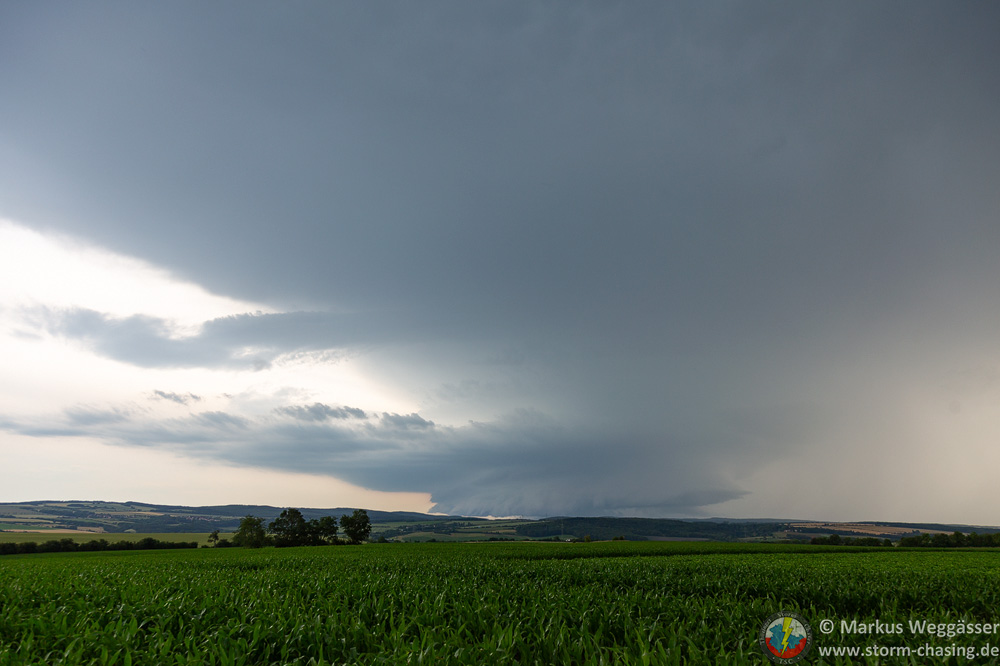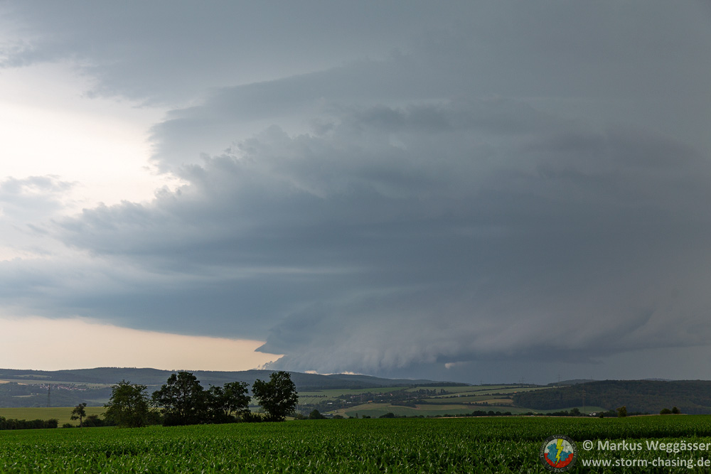 Die Entwicklung war so explosiv schnell, dass die kurze Verlagerung von Weimar nach Mellingen schon reichte, dass sich die Zelle zur Superzelle entwickelte. Dauergrummeln, Rotation, Inflow aus Osten, Wahnsinn. Würde die Landschaft anders aussehen, hätten man denken können, ich reiche einen USA-Bericht nach.