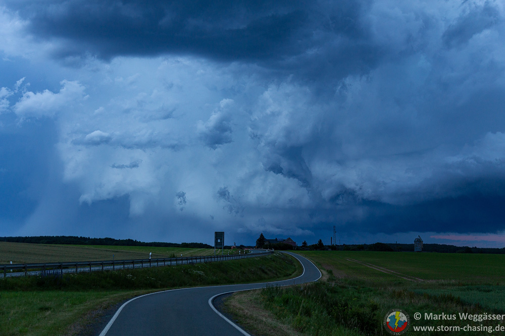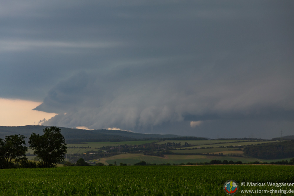 Kurz vor Hagel konnte ich wieder auf die A4 Richtung Osten auffahren, Ziel grob Lederhose/Triptis. Über Land- und Bundesstraße ging es bis nach Mittelpölnitz. Die tiefe Wolkenschwanz der Flanking-Line war bereits über mich hinweggezogen. Es war noch warm, keinerlei Wind und ich konnte nun von Südwesten her zur Superzelle schauen, die inzwischen Gera überquerte.