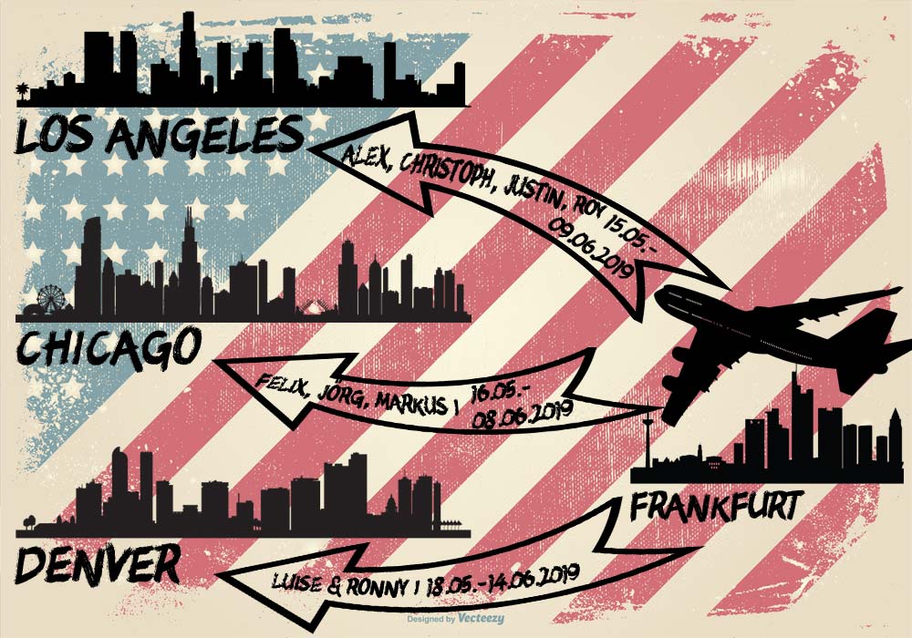 Den Start machen unsere Freunde aus Sachsen-Anhalt, die am 15.05. morgens von Frankfurt über London nach Los Angeles fliegen. Nach ein bisschen Eingewöhnung an amerikanische Großstädte geht's weiter nach Las Vegas. Am 16.05. starten Felix, Jörg und Markus von Frankfurt auf direktem Wege nach Chicago. Dort wird auch der Ankunftstag verbracht. Am 18.05., wenn Luise und Ronny in Denver landen, werden auch die beiden anderen Teams irgendwo in den Great Plains ankommen.