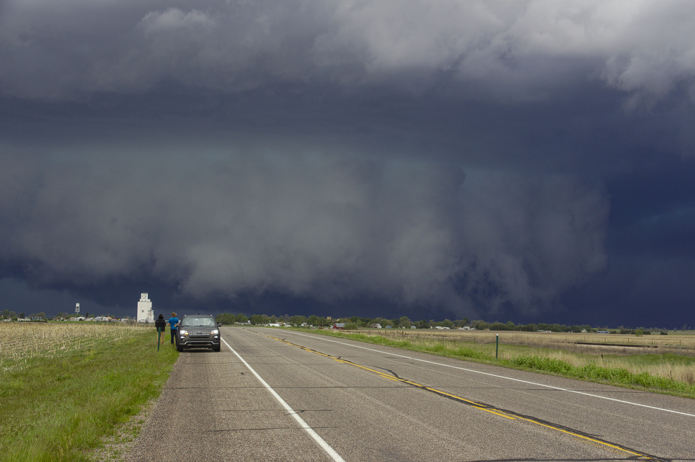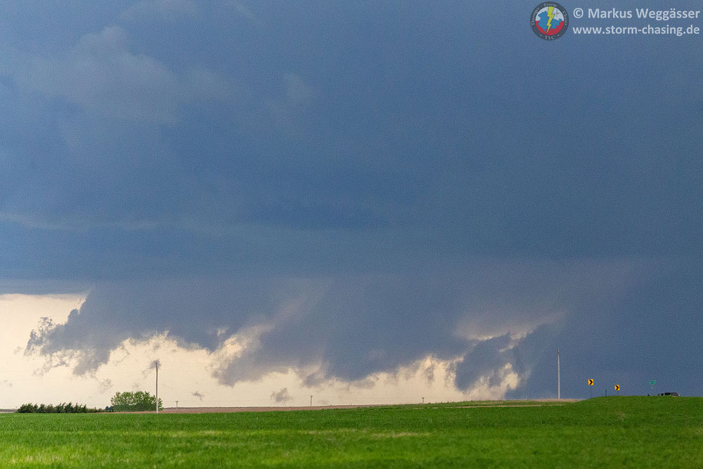 Kurz nach Osten, wieder Halt. Während unserer ganzen Jagd wurden mehrmals Tornados der Sterling-Zelle und auch von dieser Superzelle berichtet. Soweit wir jetzt wissen, waren es oft im Regen verhüllte, kurzlebige Tornados. Wir erfreuen uns eh lieber an der Struktur, die alle im Team so noch nicht gesehen haben. Die Begeisterung war entsprechend groß, wenn auch im Bann dieses Anblicks ehrfürchtiges schweigen herrschte.