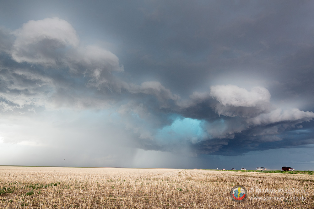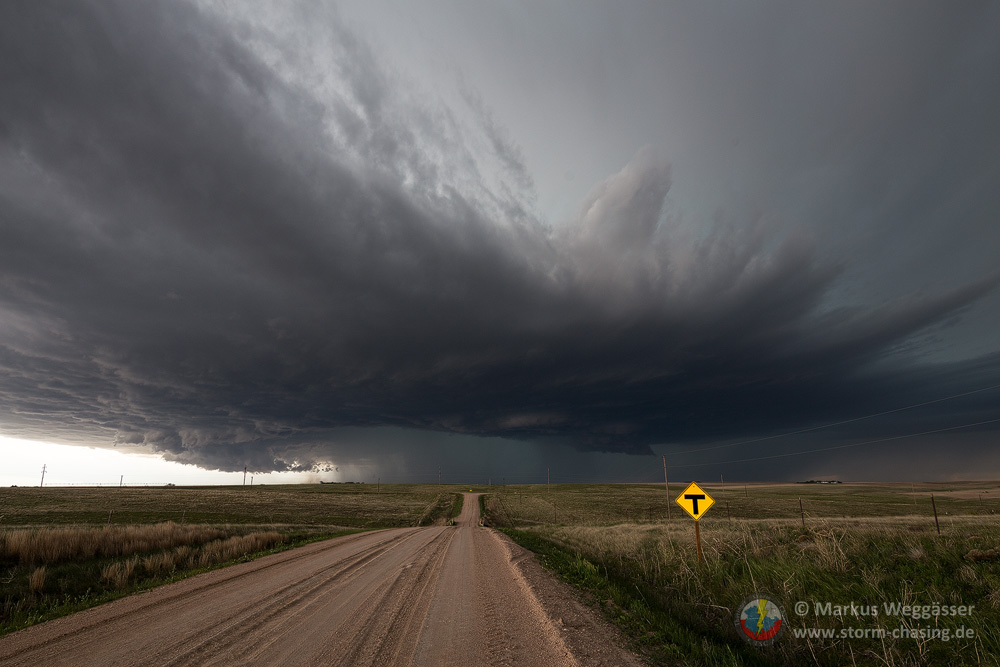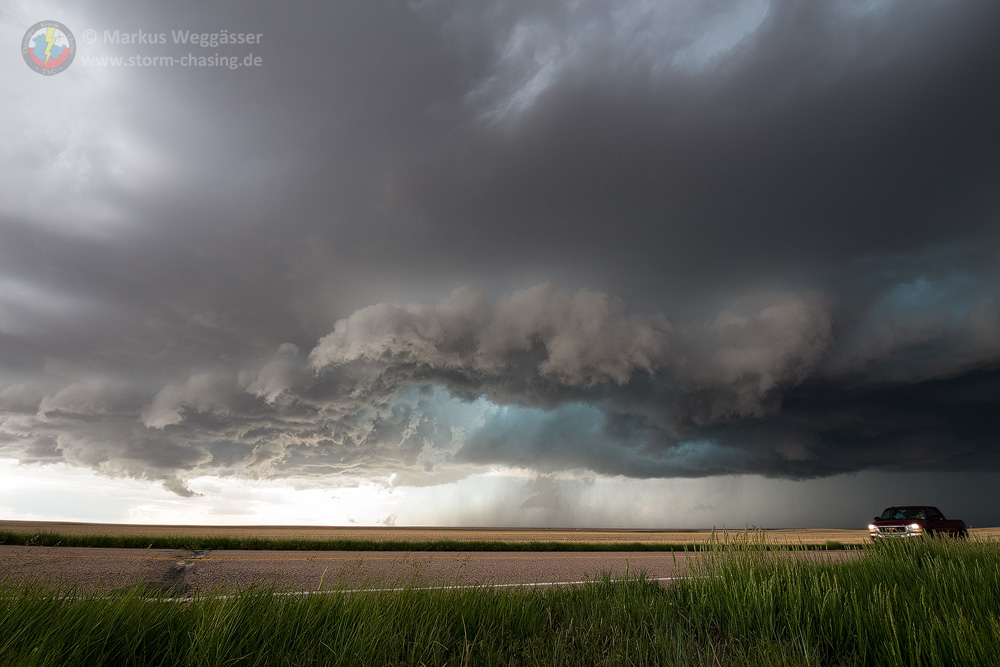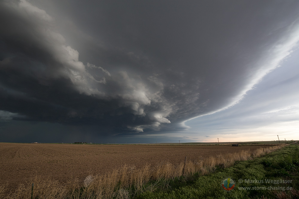 Nach gepflegtem Lunch bei Denny’s ging es westwärts nach Limon (CO) als Ausgangspunkt. Unsere erste Zelle aus den Bergen hatten wir bereits im Blick und fuhren ihr nordwärts nach Last Chance entgegen (der Ort heißt wirklich so). Mit uns die Chaserkonvergenz samt Tourbussen, DOW etc. Ab diesem Zeitpunkt entwickelte sich unsere Zelle immer prächtiger und machte deutlich, dass sie mehr will wie wir auch.