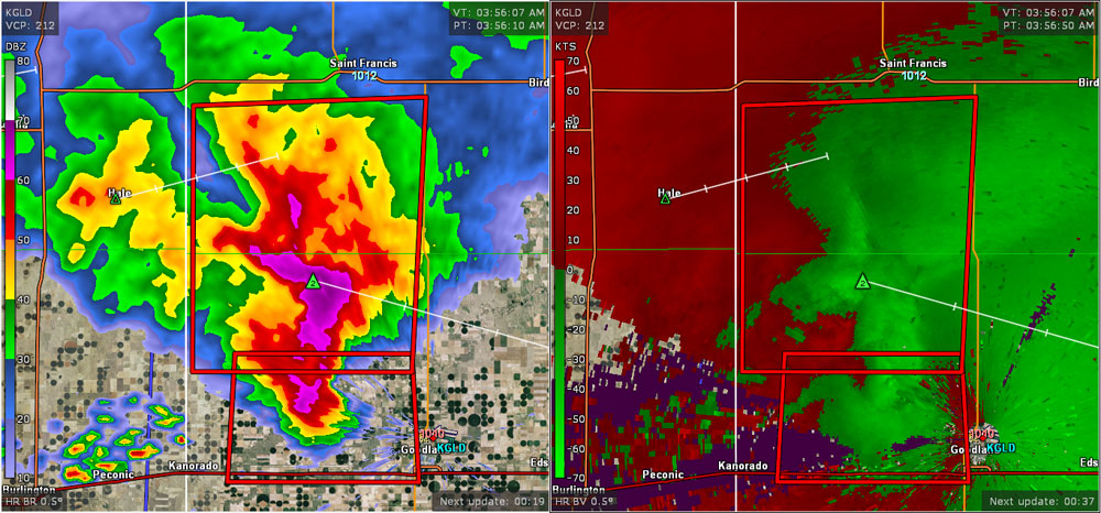 The rain wouldn’t completely disappear though, which made it difficult to see all the action that was happening in the inflow/wallcloud region of the storm. But it’s massive mesocyclone was just breathtakingly amazing. This is the reason why people including ourselves keep coming back to the Plains. The storm kept on going and was hook-shaped and tornado-warned at the radar.