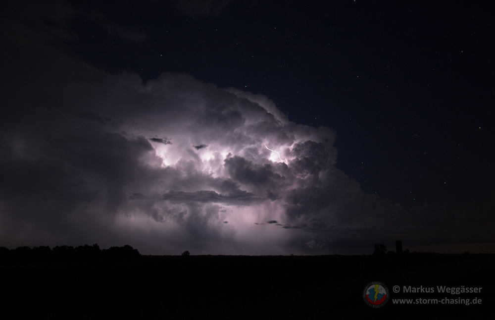 Auf dem Weg nach Fort Scott ins Motel hielt uns noch eine Bahnschranke auf und sorgte für den Corepunch. Außer starkem Regen war aber nicht mehr zu befürchten. Die Rückseite der Linie ging direkt in den klaren Sternenhimmel über – WOW! Und zwischen Sternenhimmel und Boden flogen wieder die Glühwürmchen vor den flackernden Towern am Himmel umher. Was für ein Abend!