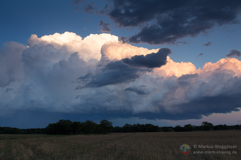 Wir verfolgten die Zelle weiter nach Südosten. Strukturell wurde sie auch immer interessanter. Es folgten bereits weitere in der Linie. Im Abendlicht fanden wir noch einen Spot zum Beobachten. Im Süden entstand nun eine Linie mit frischer Böenwalze davor: