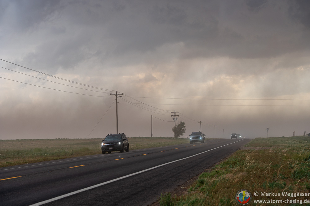 Als wir wieder Platz haben, sehen wir etwas mehr Dominanz des Abwinds. Der MCS-Mode ist on. Es ist dennoch fotogen. Und wie in Nebraska vor wenigen Tagen haut es hier wieder böse Erdblitze raus. Einer ist recht nah. Wir gehen mal ins Auto und fahren weiter.