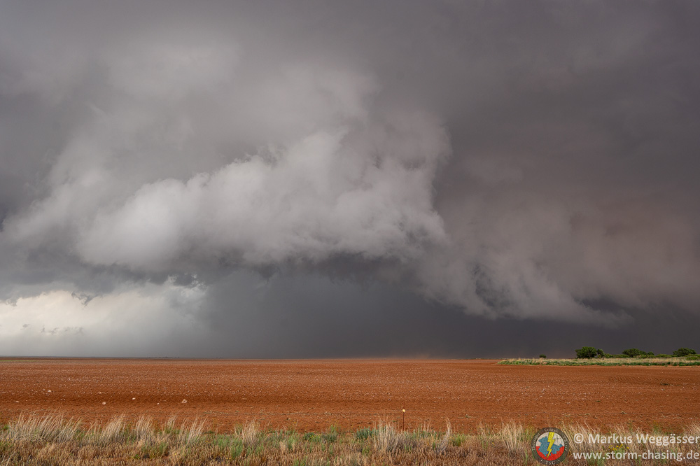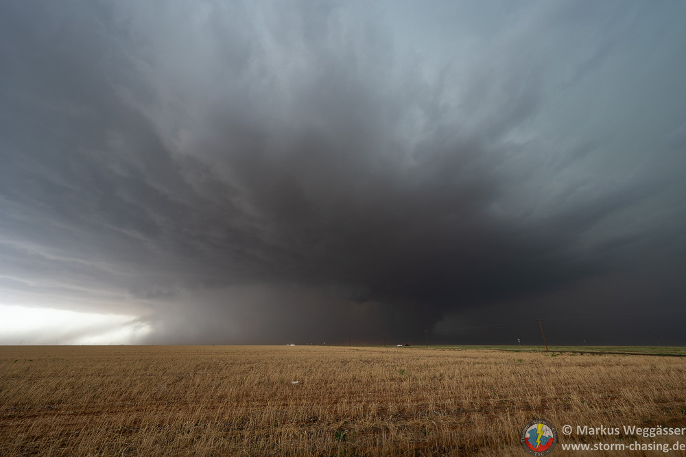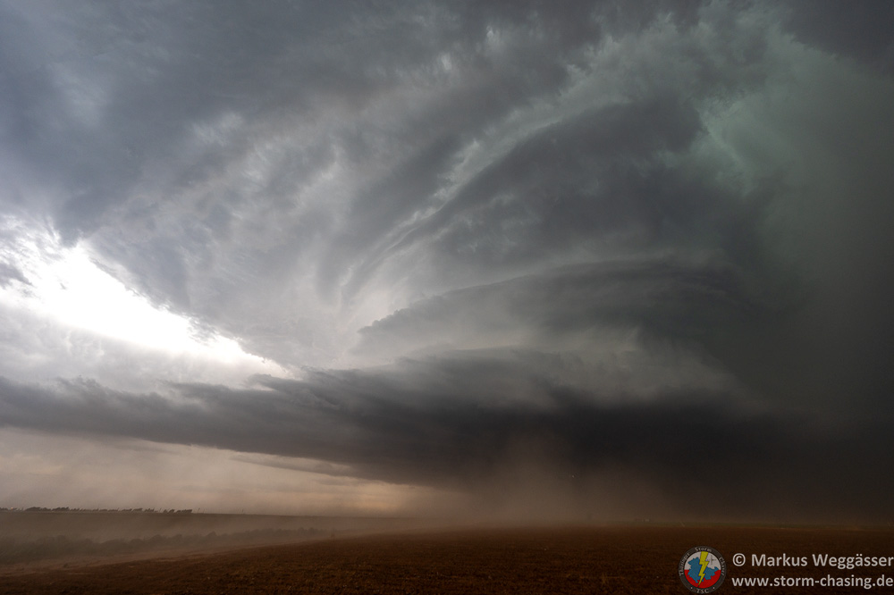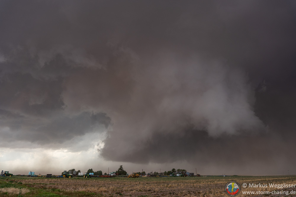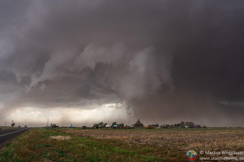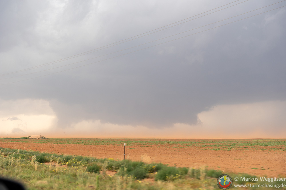 Zuerst halten wir aber nochmal für die Strukturbilder. Da diese riesige Superzelle enormen Inflow hat und die Felder trocken sind, kommt als Challenge dazu, etwas staubgeschützt zu stehen. Grüße an Christoph Geissler – es wäre ein großer Tag für dich gewesen!