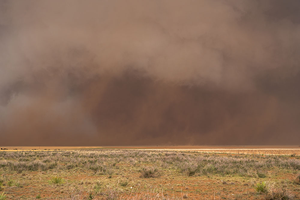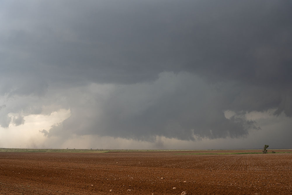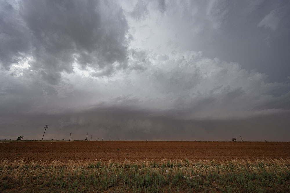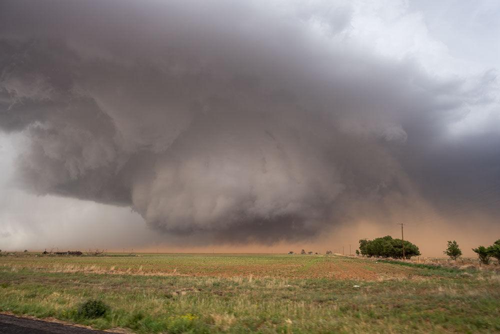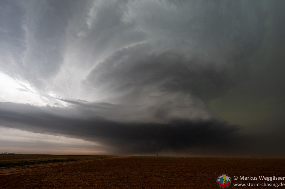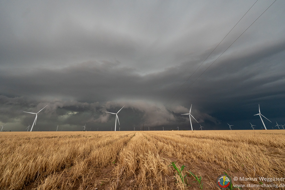 Zuerst halten wir aber nochmal für die Strukturbilder. Da diese riesige Superzelle enormen Inflow hat und die Felder trocken sind, kommt als Challenge dazu, etwas staubgeschützt zu stehen. Grüße an Christoph Geissler – es wäre ein großer Tag für dich gewesen!