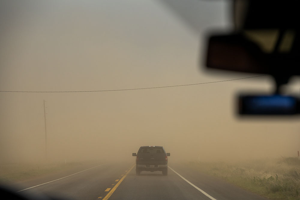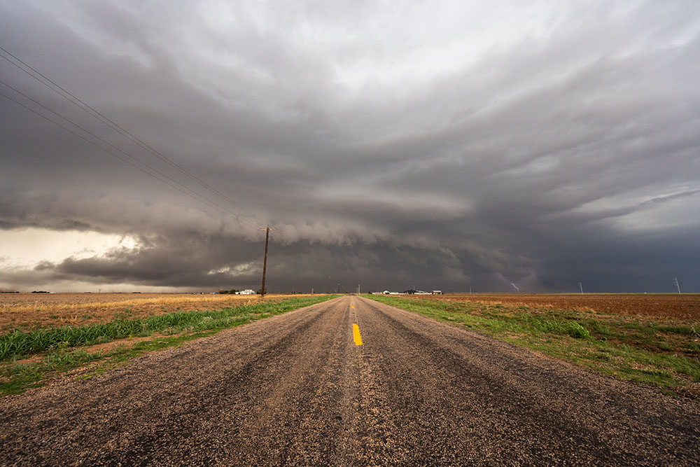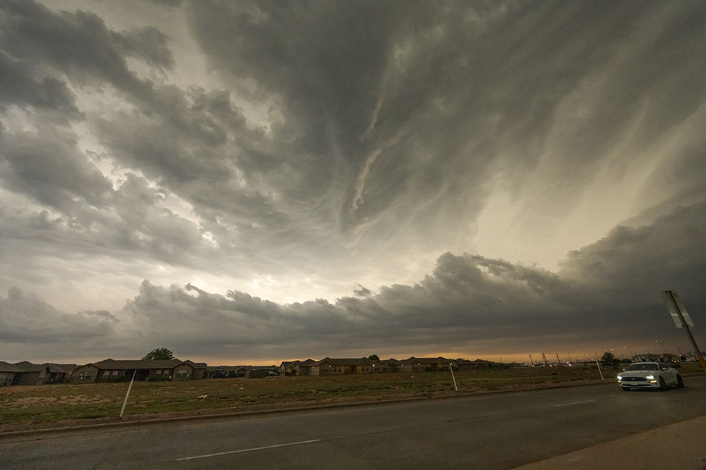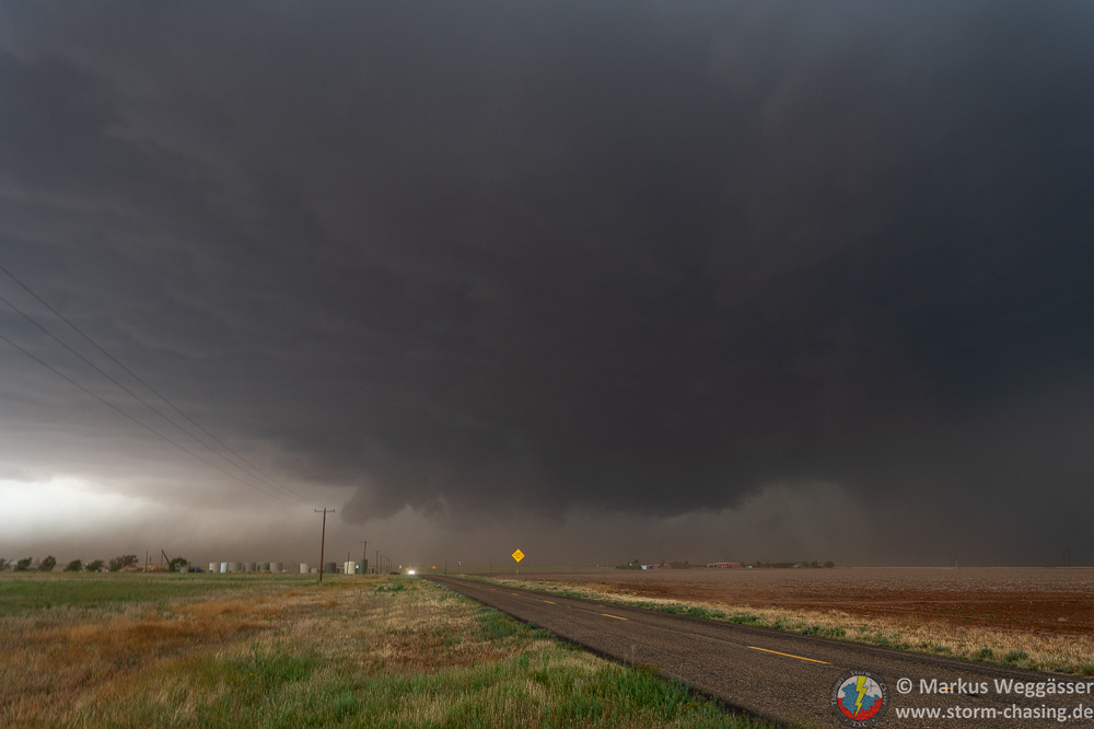 Wir müssen wieder weiter. Die Superzelle ist sehr groß und zieht recht schnell. Wir müssen auch bedenken, dass sie Kurs auf Lubbock nimmt. Das ist für die Stadt sehr schlecht. Ein Tornado in solch einer großen Stadt ist der Worst Case. Aber auch ohne gibt es großen Hagel, ergiebigen Starkregen und kräftige Windböen über 100 km/h. Unsere Probleme dagegen sind eher marginal. Wir müssen einfach vor der Zelle bleiben und die Stadt umfahren.