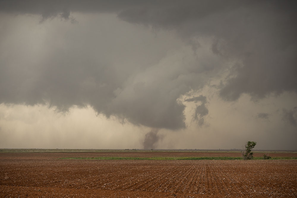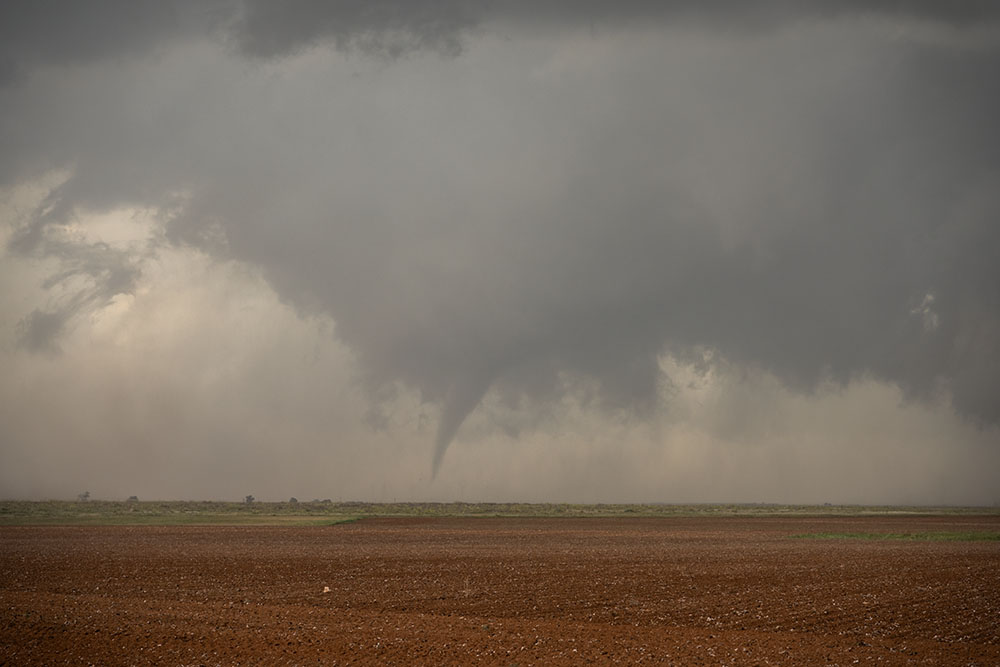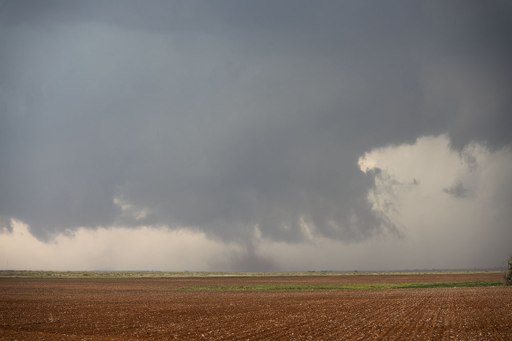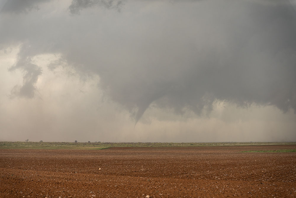 Als die Kante sichtbar wird, können wir es kaum glauben. Was für ein riesiges Teil! Eine gigantische rotierende Staubtrommel auf dem Boden. Tornado Nr. 5. Wedge Nr. 1.