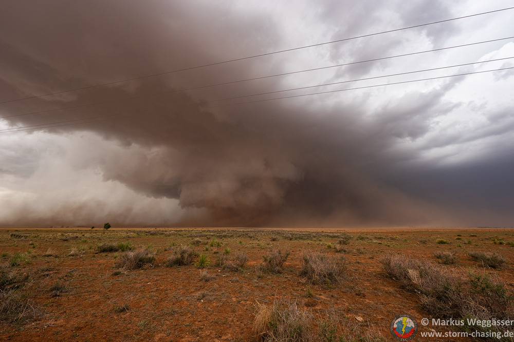 Eine mystische Stimmung erwartet uns am nächsten Halt. Die Superzelle ist so hoch und mächtig, dass es dunkel wird als bricht die Nacht ein. Dazu Geflacker, Donner und Staub, der zur Zelle gezogen wird.