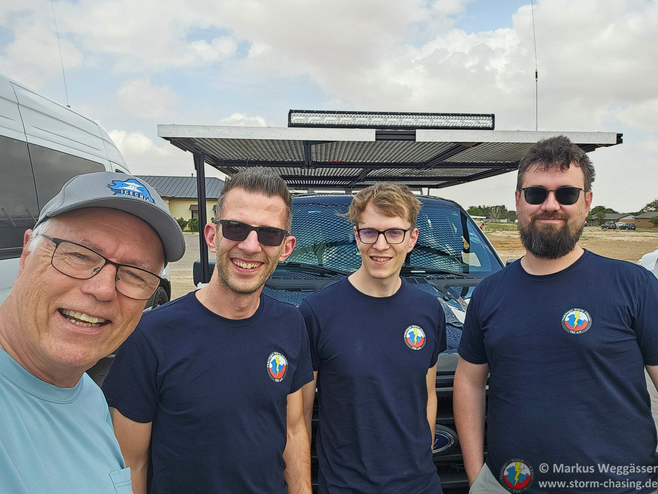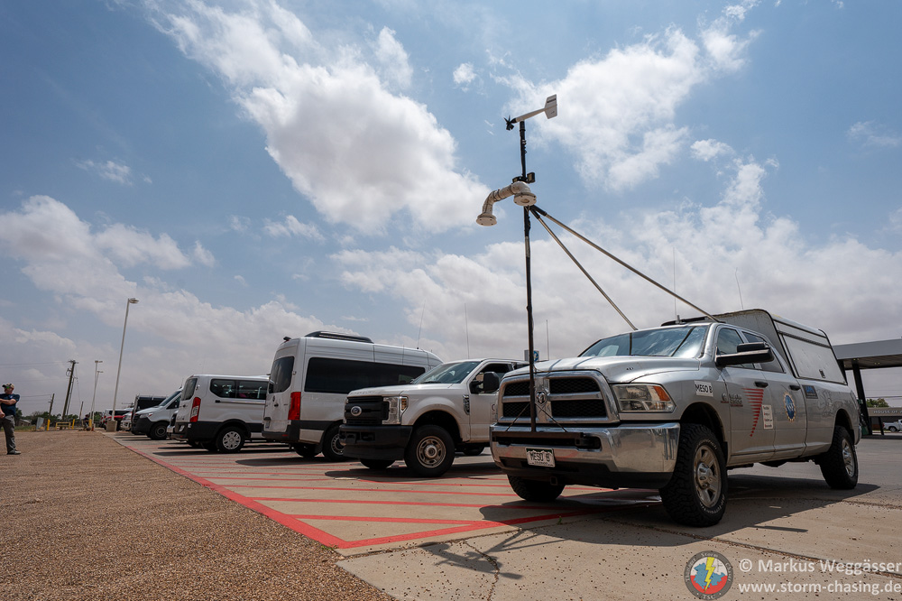 Ein Blick in die Mesoanalyse zeigt uns, dass wir uns besser etwas nördlicher positionieren sollten. Also zurück nach Brownfield. An der dortigen Tankstelle sind wir nicht alleine. Die Fahrzeuge des ICECHIP Forschungsprojektes haben neben anderen Chasern bereits den Parkplatz eingenommen. Dazu bester Tornadohimmel.
