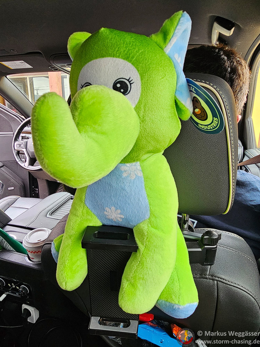 Wir treffen Tim Marshall, der uns ein bisschen was über das Projekt erzählt und die Hageldellen im Auto zeigt. Ebenso „Dummies“ von Dächern im Kastenaufbau des Fahrzeugs. Das Ziel ist es, direkt in den Hagel zu fahren. Das würde uns auch Spaß machen. Ab 10cm Durchmesser wird es richtig gefährlich im Auto, sagt Tim.