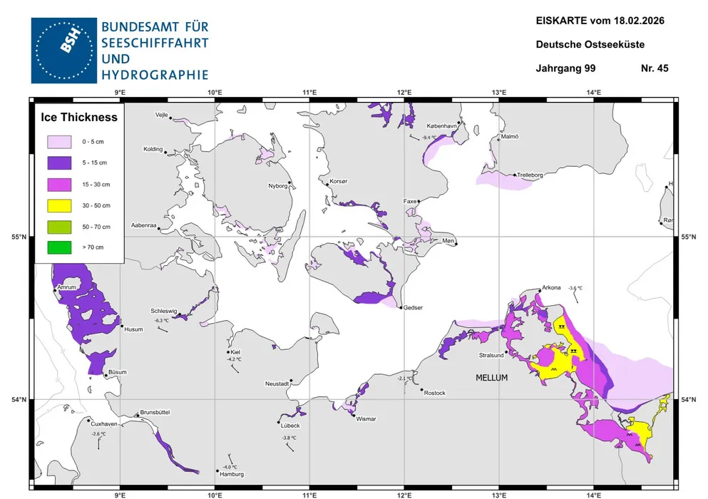 Zur Besseren Übersicht zunächst die zwei Eiskarten des Bundesamtes für Seeschifffahrt und Hydrographie, die ich leider erst hinterher entdeckte, die aber genau das Abbilden, was wir vor Ort erlebten, nämlich die völlig verschiedene Verteilung des Eises zwischen Zinnowitz und den Kaiserbädern.