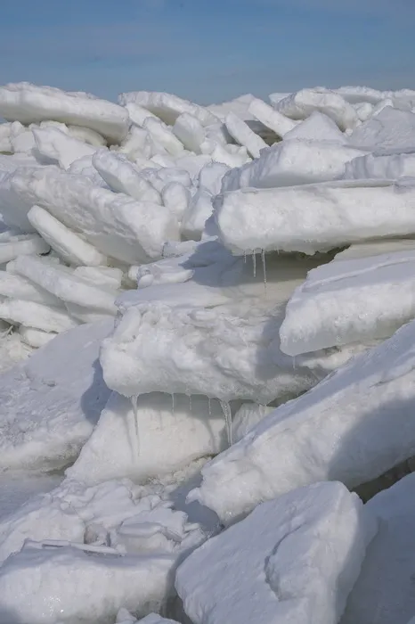 Doch diese frostige Stille hatte ihren ganz eigenen Reiz. Bis zum Horizont erstreckte sich eine endlose Eislandschaft, ganz entfernt gerade noch von der untergehenden Sonne beschienen. Strandnah musste man zunächst wellenförmiges kompaktes und ziemlich glattes Eis passieren um dann auf den zusammengewachsenen Schollen weiterlaufen zu können. Einige Besucher hatten lose Eisschollen zu pitoresken Türmchen gestapelt.