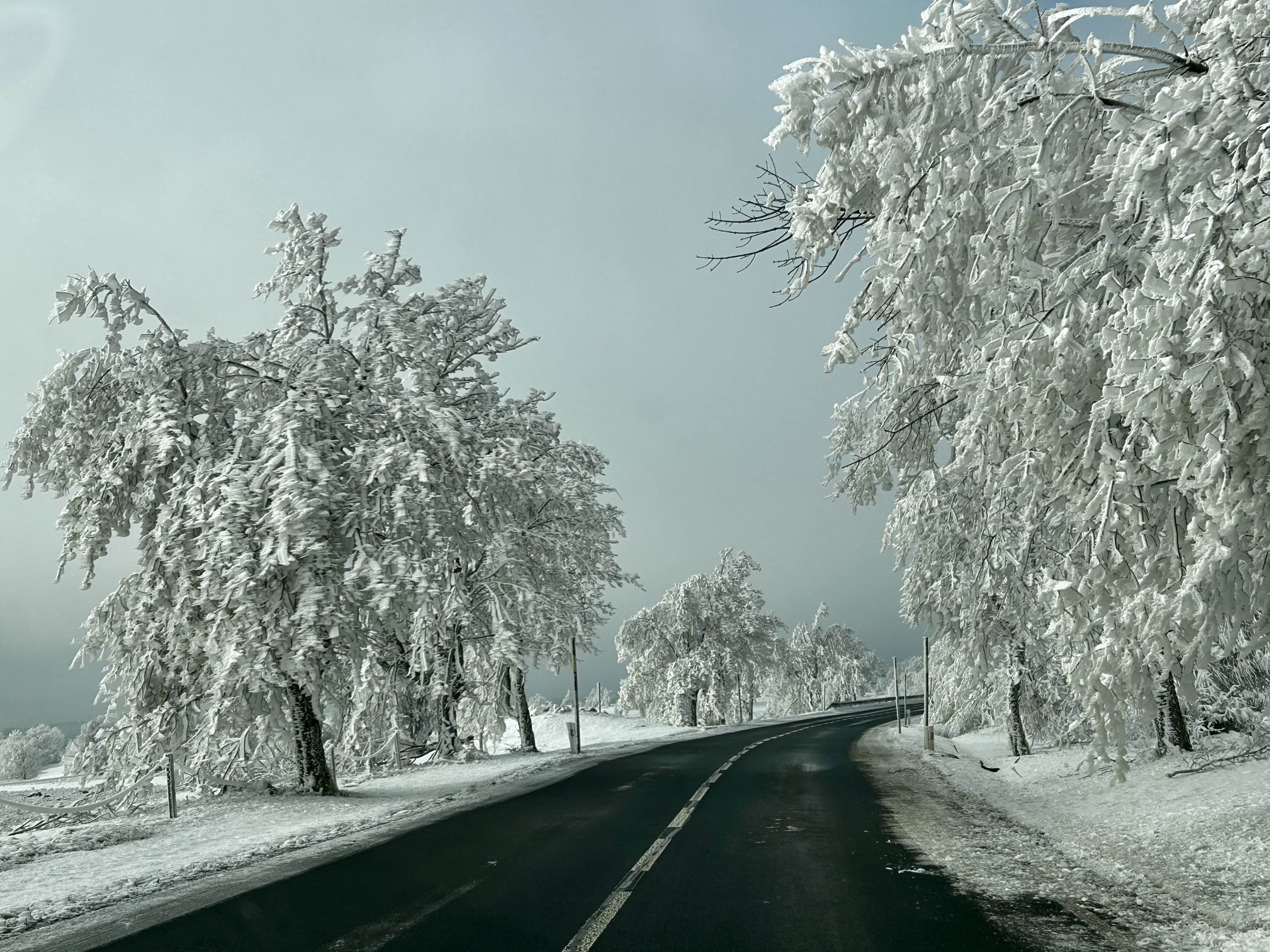 Moin, kalter böhmischer Wind hier, Äste lagen heute Früh auf der Straße, kam gerade im Radio das bei Satzung/Jöhstadt eine Straße wegen Reif und herabgefallen Ästen gesperrt ist, gab auch einen schweren Verkehrsunfall