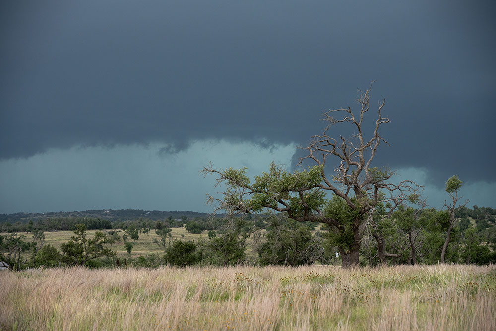 Als wir uns nähern zeigt sich vor uns eine schwarze Wolkenwand mit einer undefinierbaren Böenfront, ansonsten keine Struktur. Wir halten, steigen aus und sind überrascht: Straffer Outflow bei 67°F (19°C), da bekommt man schon mal Gänsehaut nach den letzten Tagen. Das Radarbild passt nicht wirklich zur tatsächlichen Zelle: