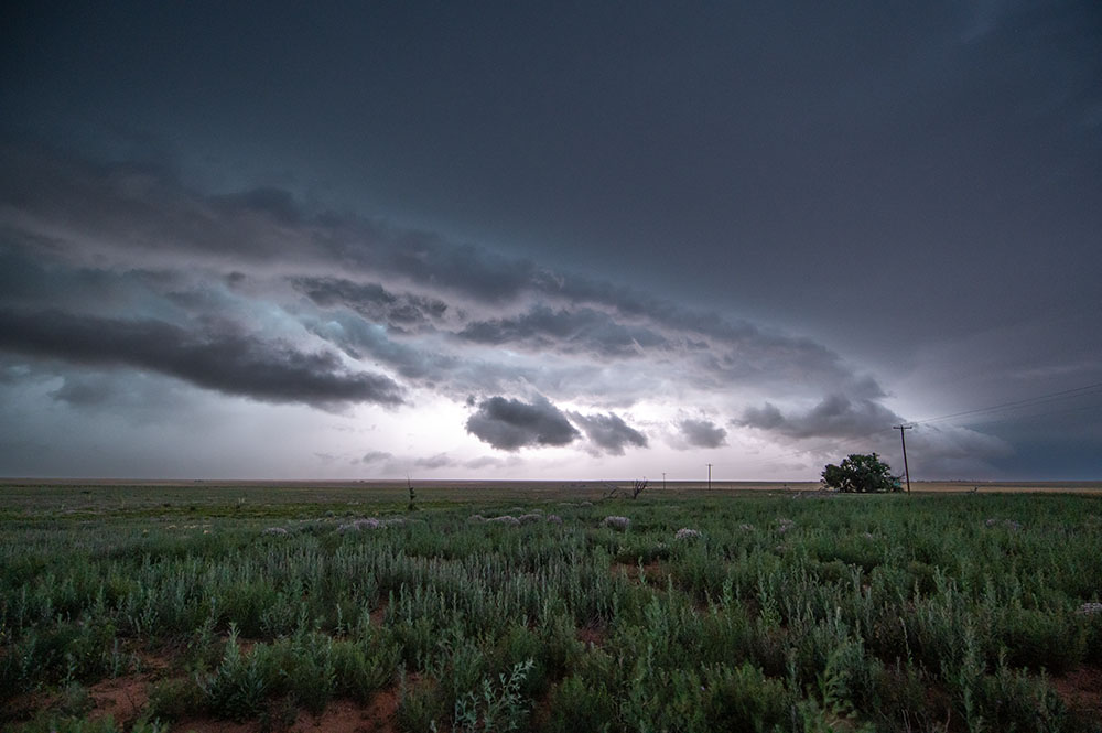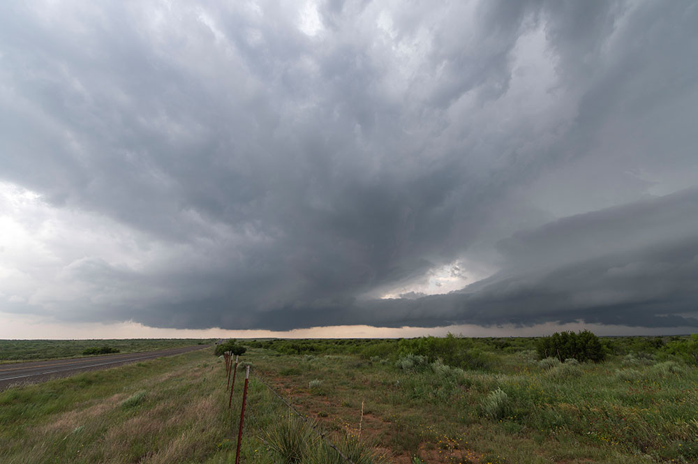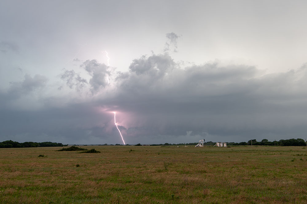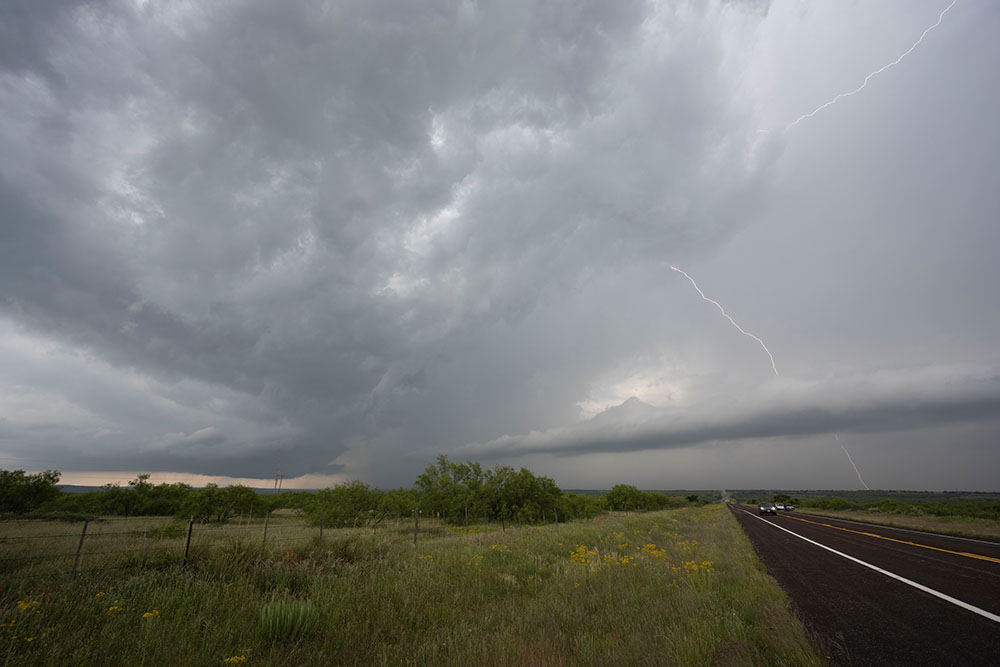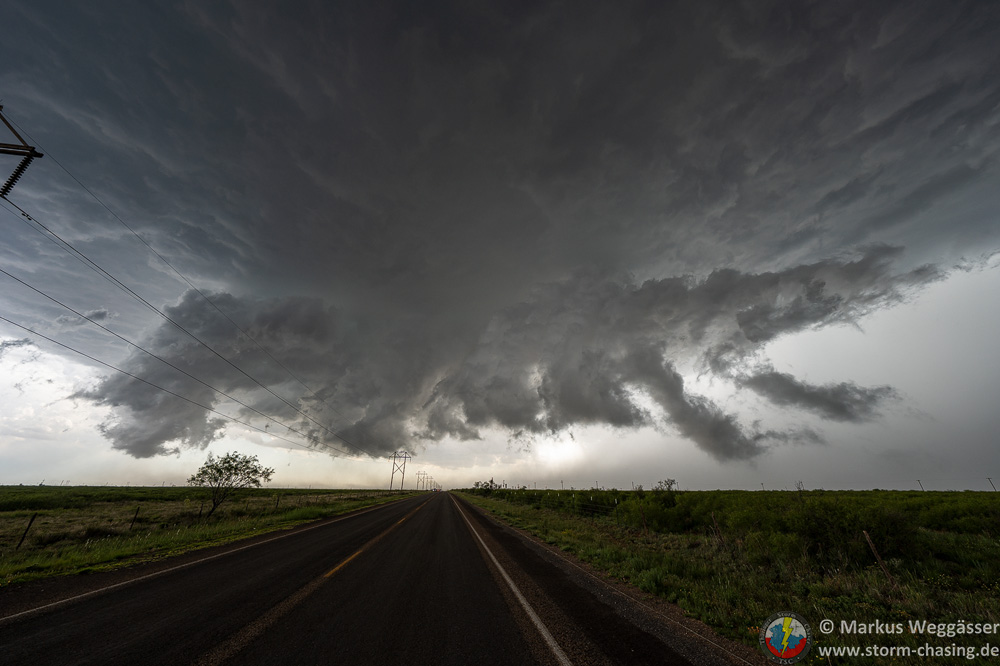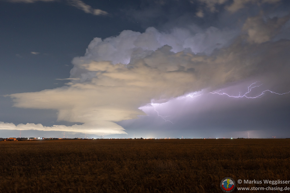 Wir genießen noch die Blitzshow der Superzelle nördlich von Lubbock, als sich immer mehr Struktur herausschälte. Zudem wurden die Blitze immer beeindruckender. Trotz der späten Uhrzeit und der vollkommenen Übersättigung mussten wir an der Stelle noch ein weiteres mal halten. Vor uns war eine mittlerweile LP-Superzelle, welche genial freistehend war und immer wieder Blitze aus dem Aufwind warf.