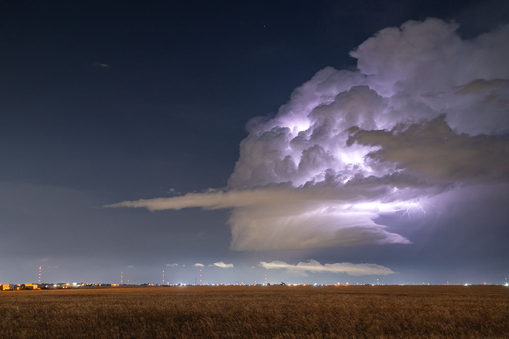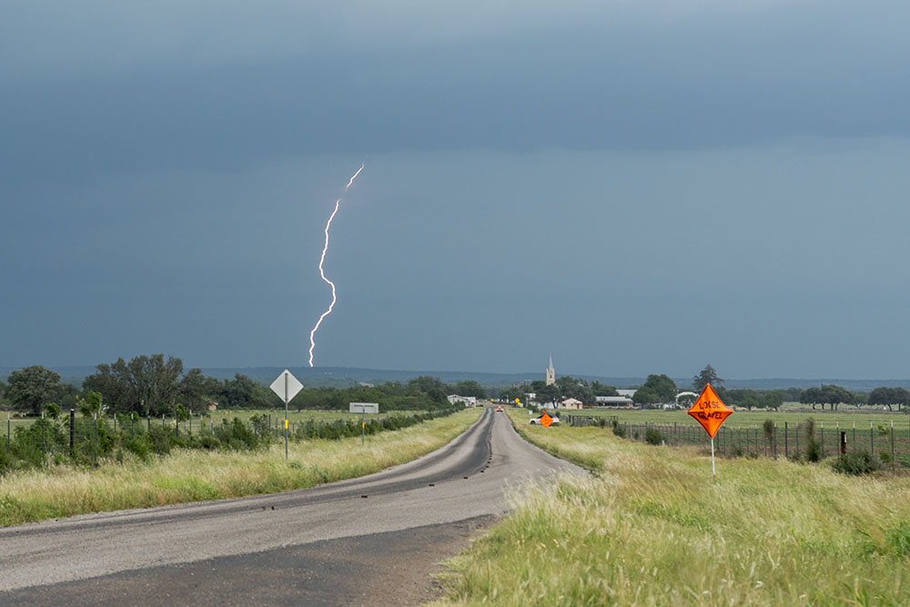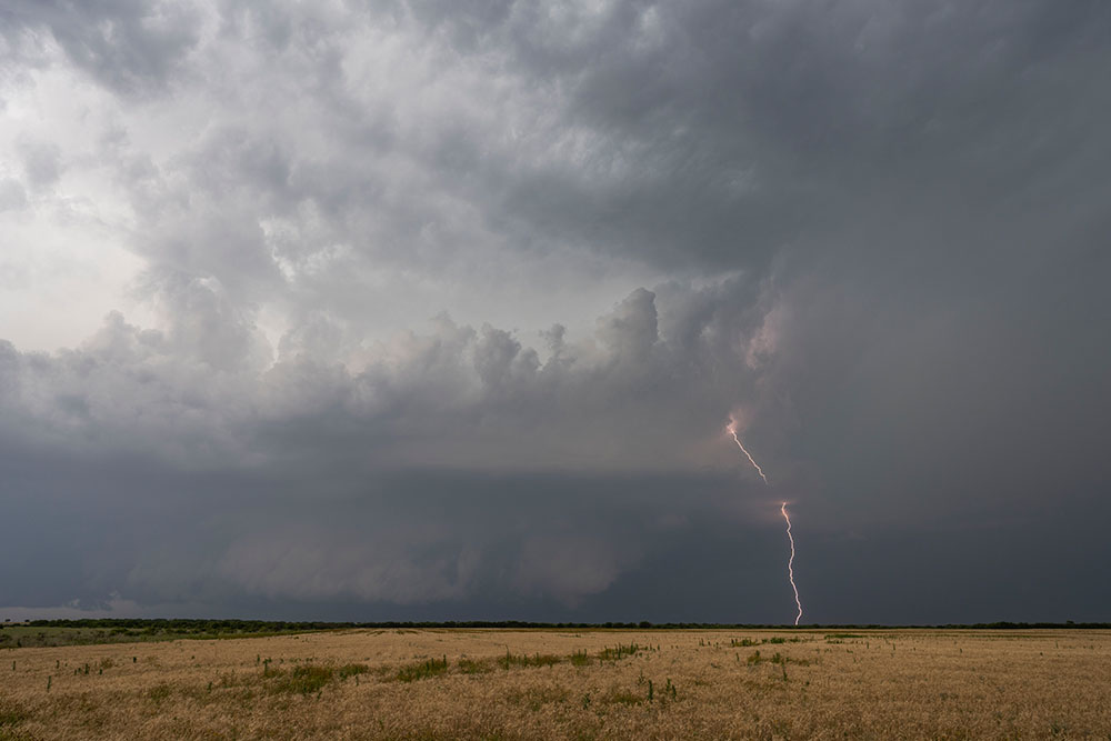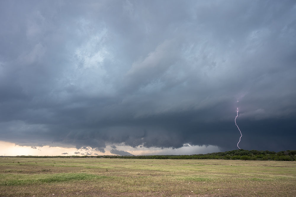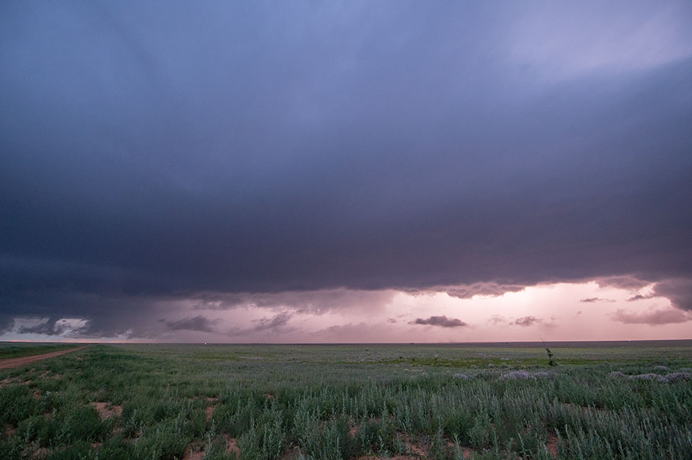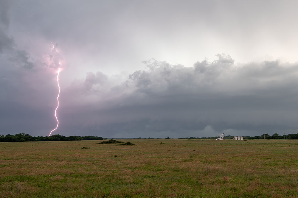 Wir genießen noch die Blitzshow der Superzelle nördlich von Lubbock, als sich immer mehr Struktur herausschälte. Zudem wurden die Blitze immer beeindruckender. Trotz der späten Uhrzeit und der vollkommenen Übersättigung mussten wir an der Stelle noch ein weiteres mal halten. Vor uns war eine mittlerweile LP-Superzelle, welche genial freistehend war und immer wieder Blitze aus dem Aufwind warf.