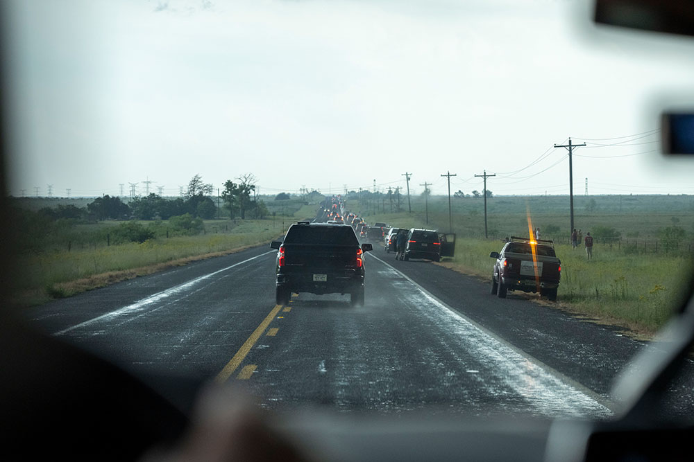Nach wenigen Minuten mussten wir weiter. Die Zuggeschwindigkeit war mittlerweile so hoch, dass wir trotz 40 Minuten Fahrzeit nach Pampa kaum Abstand herausfahren konnten. Erschwerend kam hinzu, dass südöstlich von uns ein weiteres Gewitter ausgelöst hat, durch welches wir durchbrechen mussten. Obwohl die Hagelanalyse bereits von 1,5“ Hagel ausging, war das die einzige Option, denn hinter uns wartete deutlich größerer Hagel. Der Hagelkern ging zum Glück vor uns über die Straße, sodass wir nur Hagel mit 2-3cm abbekommen haben. Geschafft, kurz vor Pampa waren wir wieder vor dem Gewitterkomplex.
