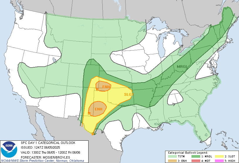 So in etwa verlief der heutige Morgen, als wir die Lage studierten. Fast bis ins letzte Detail steht heute die identische Lage wie bereits gestern an. Beim Prüfen des SPC-Outlooks dachten wir schon, die Seite aktualisiert nicht – dabei sieht der SPC-Outlook einfach identisch aus. Lediglich die Einstrahlung ist etwas bessere, was etwas höhere Temperaturen zulässt, wobei das Scherungsprofil etwas abgeschwächt ist. Ansonsten werden heute erneut an einer Outflow Boundary, welche an derselben Stelle wie gestern liegt, Gewitter auslösen, die entlang der Boundary nach Osten ziehen.