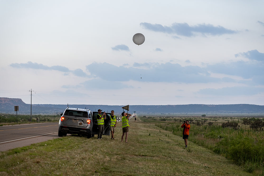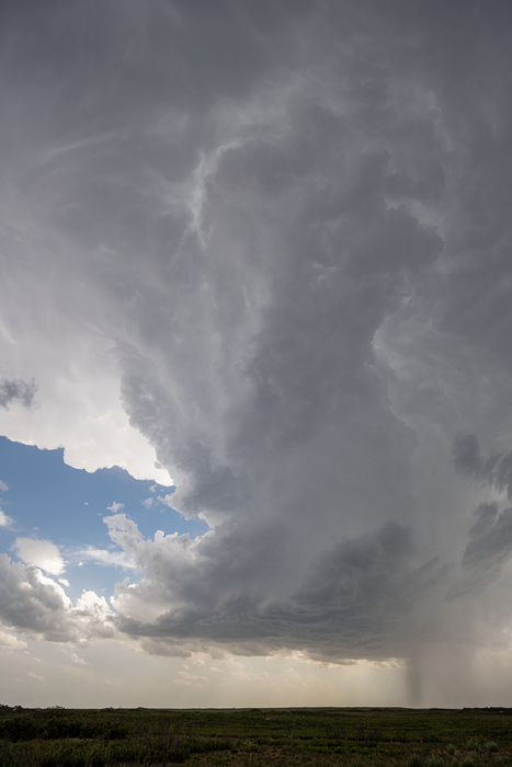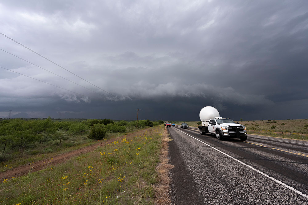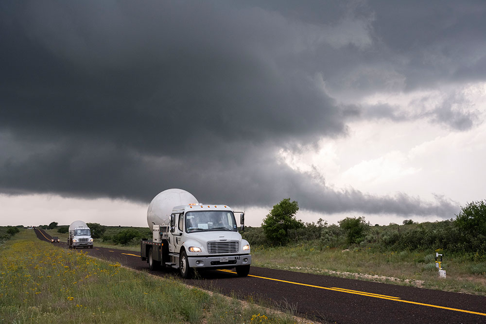 Wir positionieren uns genau an der Grenze zum Niederschlag, direkt unter dem Aufwindteller und lassen den Niederschlag mit Hagel nördlich von uns vorbeiziehen. Besonders beeindruckend ist der Niederschlagsfuß. Nebenan lässt ein wissenschaftliches Team noch eine Radiosonde aufsteigen.