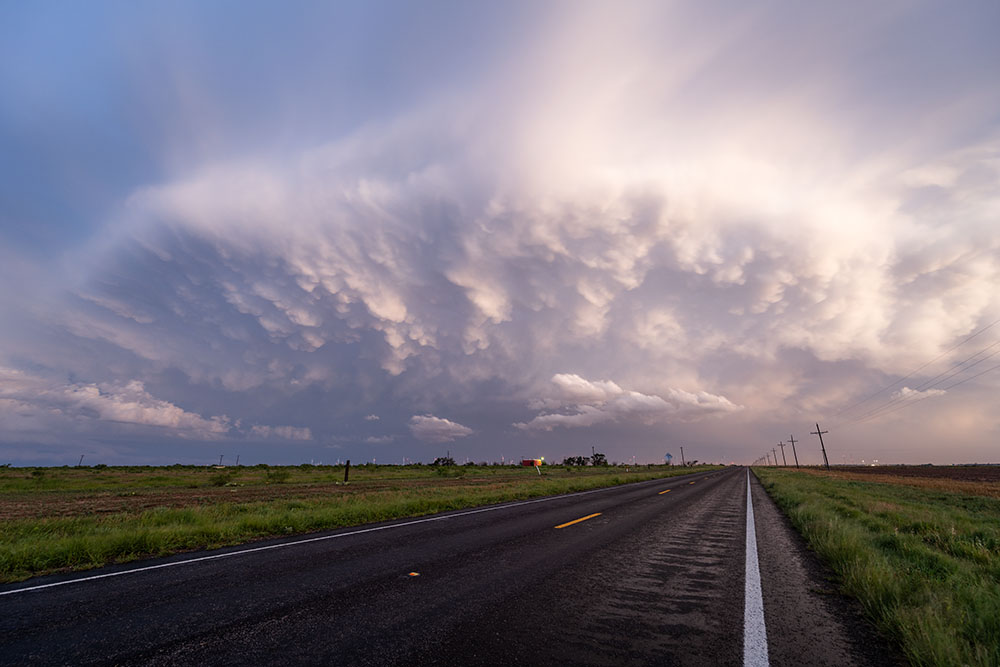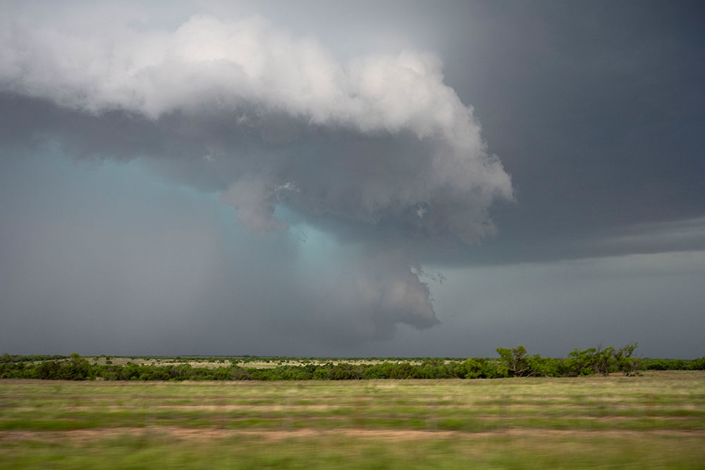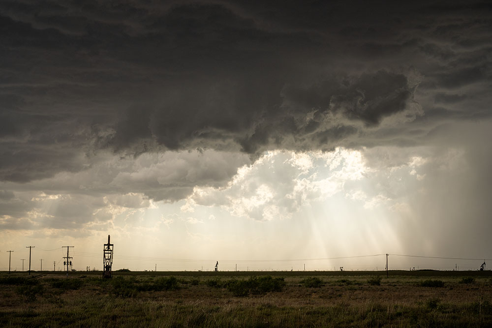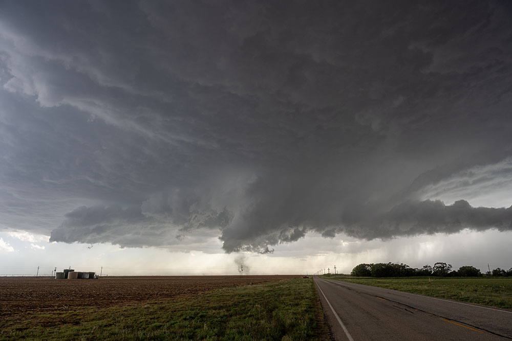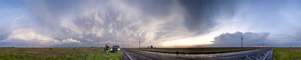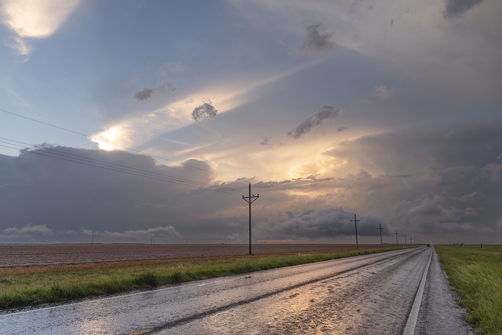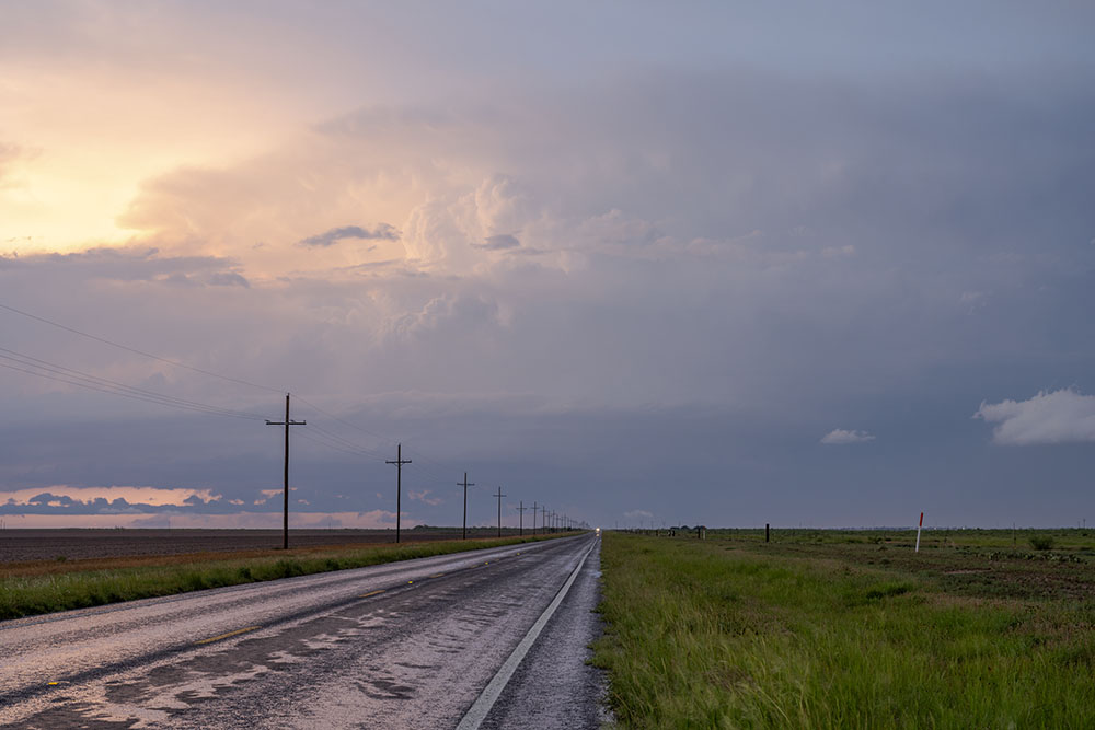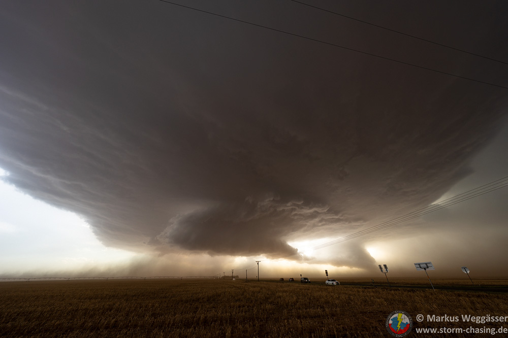 An einem passenden Haltpunkt angekommen zeigte sich uns ein Panorama aus insgesamt drei Superzellen. Südöstlich von uns die abziehende Superzelle, nördlich von uns der frühere Leftmover und nordwestlich von uns eine weitere Superzelle mit Zugrichtung auf Lubbock. Die Sonne zaubert nochmal eine schöne Lichtstimmung.