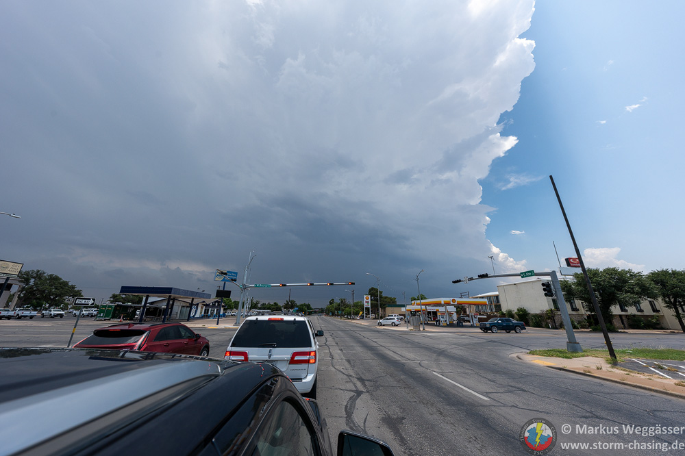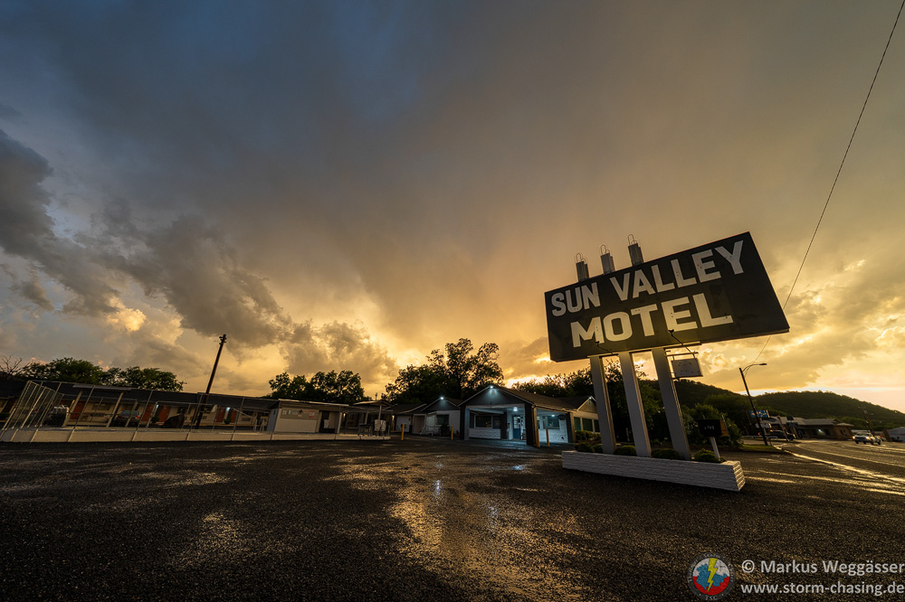 Die weitere Fahrt zur mittlerweile gebuchten Unterkunft in Tucamcari stellte uns vor eine große Herausforderung, da die Gewitter immer mehr verclusterten und jeder neue Aufwind sofort zu rotieren begann und für ordentlich Hagel sorgt. Und wir mussten durch diesen Cluster durch, ohne vom Hagel getroffen zu werden. Direkt vor Tucamcari hieß es dann noch einmal längere Zeit zu warten, da dort eine Superzelle mit Tennisball großem Hagel entlangzog. Als wir schließlich angekommen waren, gab es auf einigen Straßen noch Flashflooding.