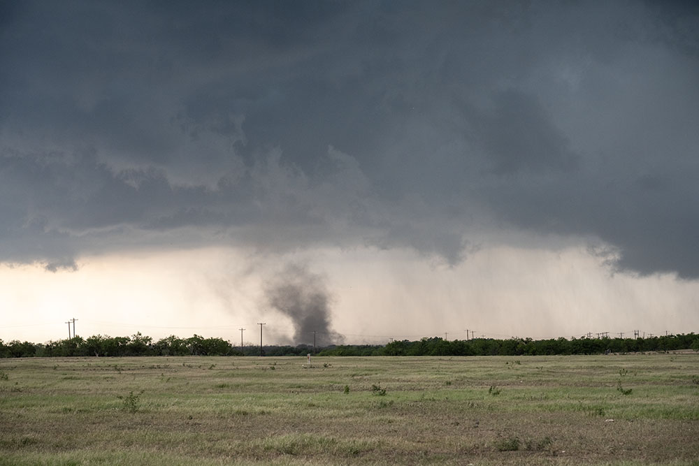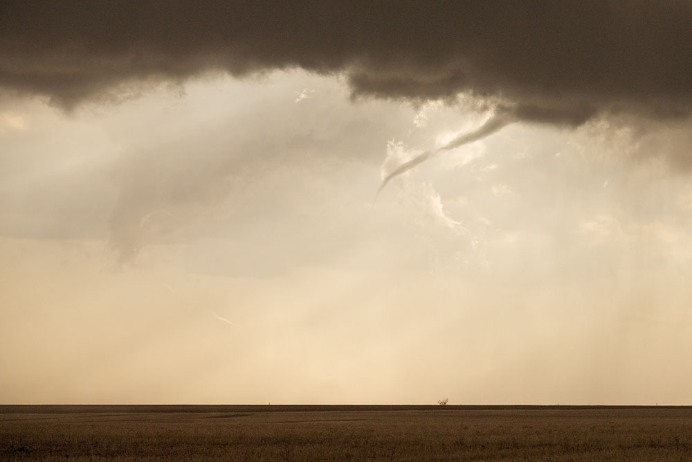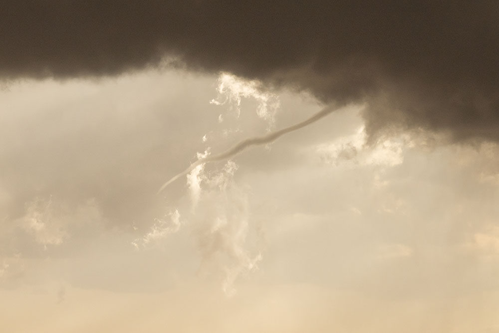 Wir verlagern uns erneut wenige Minuten weiter, damit wir nah am Geschehen bleiben – und da ist er, der erste (eindeutige) Tornado des Tages. Wir können ihn in Ruhe beobachten.