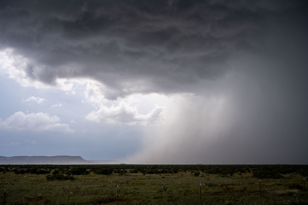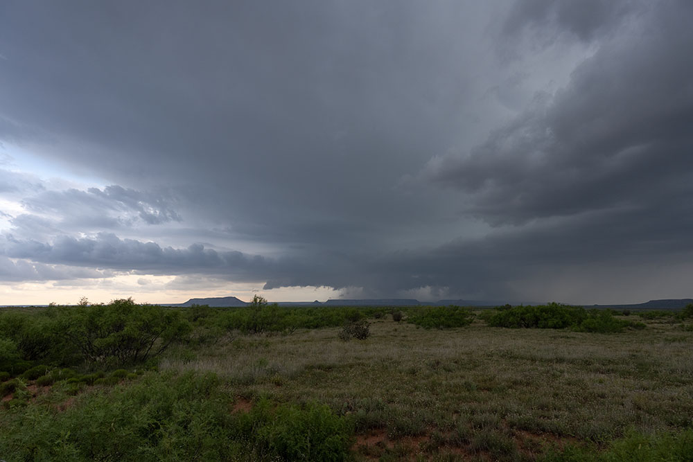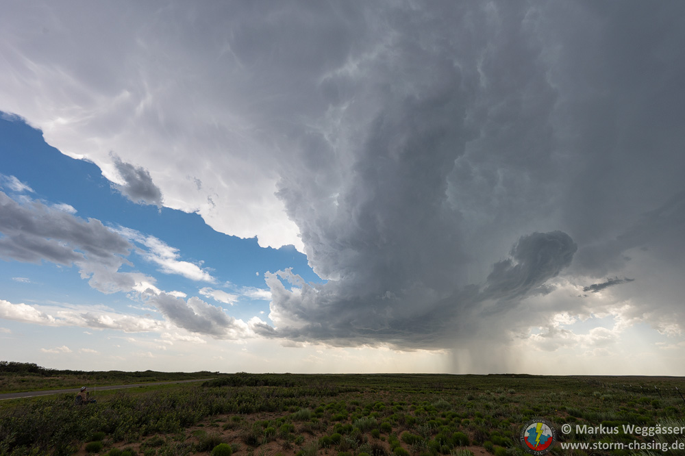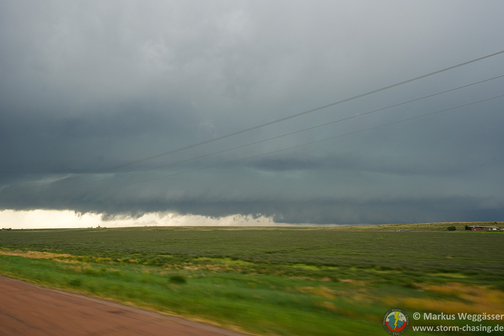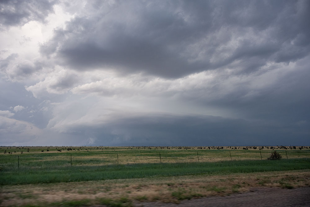 Wir wollen nochmal davor und folgen einer State-Road nach Osten, allerdings scheint sich unser Gewitter nun mit den anderen Entwicklungen und unter anderem der Left-Mover Superzelle von Tucumcari zu einem großen HP-Monster zu vereinigen, weshalb wir sie ziehen lassen. Der ganze Komplex wird später noch massiven Niederschlag, großen Hagel und ggf. einen im Regen verhüllten Tornado hervorbringen, welcher aber nur vom Radar angedeutet ist, ohne tatsächliche Beobachtungen. Nachfolgend noch ein Bild der Rückseite des Komplexes.
