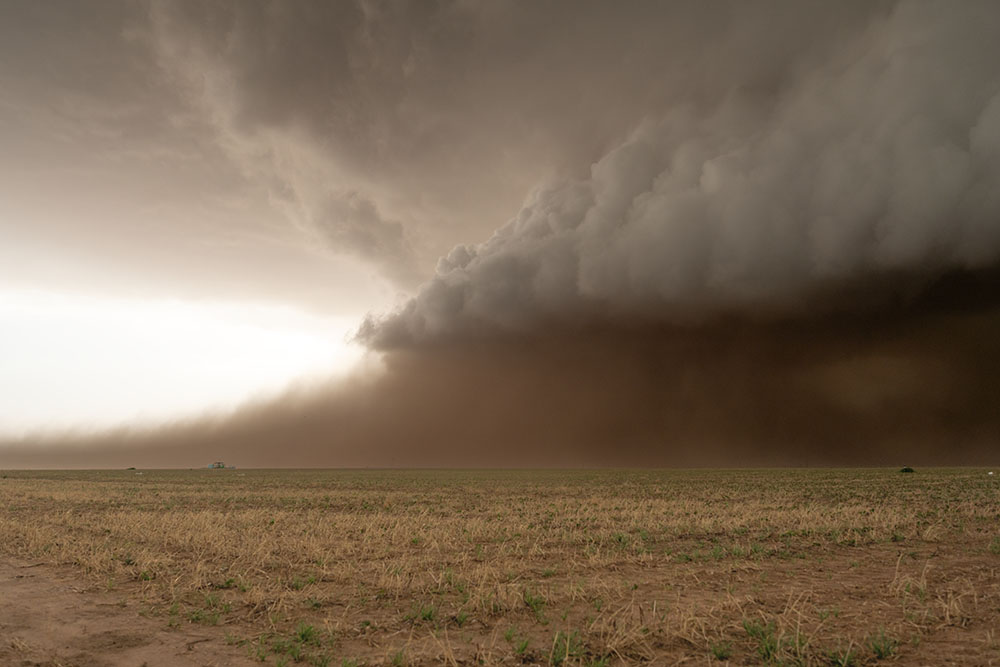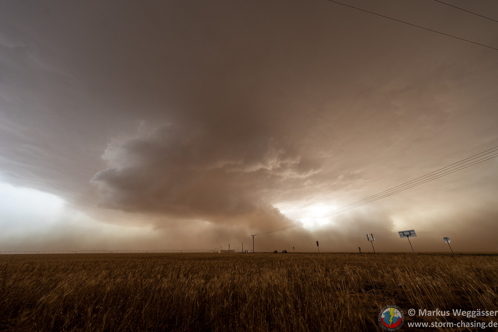 Der Inflow wird zunehmend stärker, sodass immer mehr Staub aufgewirbelt und in die Superzelle eingesaugt wird. Die Sicht wird dadurch zwar gestört und die Kameraausrüstung muss leiden, dafür sorgt der Staub für ganz besondere Lichtstimmungen. Ein weiterer Nebeneffekt ist, dass bereits kleinste Tornados mit Bodenkontakt sichtbar werden, weil der Staub direkt den Fuß des Tornados enthüllt. Wir stehen unter der Wallcloud, es gibt immer wieder Wirbel zu sehen, mitzählen kann man da nicht mehr. Wir fahren weiter.
