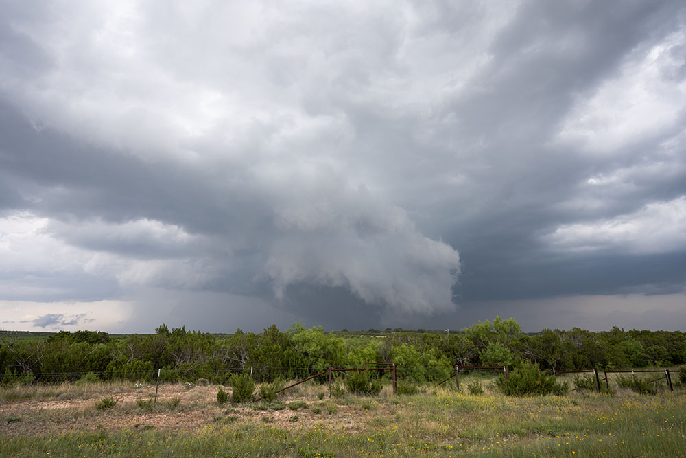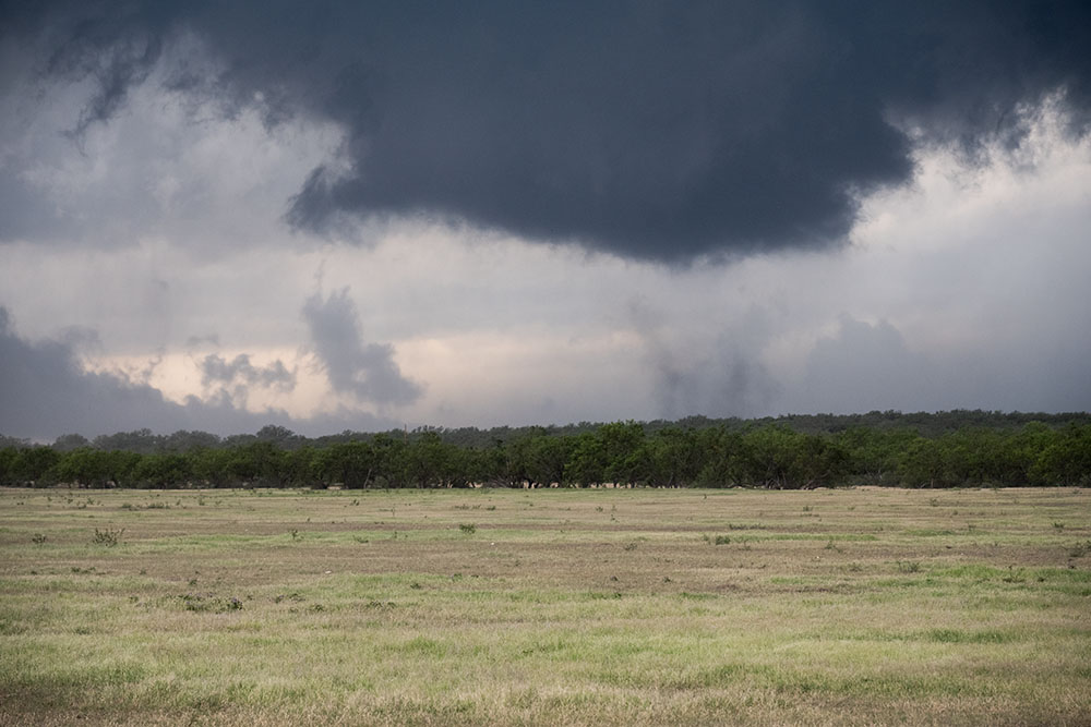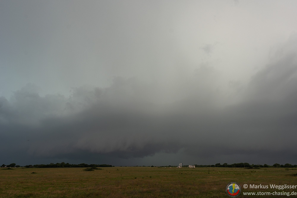 Jetzt heißt es erst einmal warten. Wir fahren wieder nach Morton, wo am Vortag ein Tornado nur knapp nördlich der Stadt vorbeigezogen ist. Langsam gibt es erste Quellungen auf der Seite von New Mexiko, welche aber instantan von der Scherung zerrissen werden, wie schön auf dem Satellitenbild zu erkennen ist. Schließlich entwickelt sich ein kleines Stückchen südöstlich von uns ein erstes Gewitter, welches substantiell zu sein scheint. Wir warten noch kurz und fahren es an. Die Basis sieht gut aus, wenngleich sie noch elevated ist.