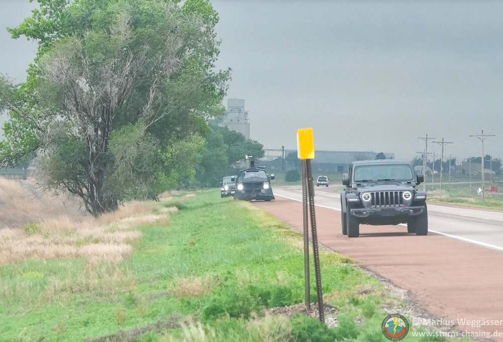 Mittlerweile lösen auch bei unserer isolierten Zelle vorlaufend weitere Gewitter aus. Uns wird bewusst, heute haben wir beim Gewitterbingo auf die falsche Zelle gesetzt. Aber wir sind nicht die einzigen. Viele andere Chaser stehen ebenfalls in unserem Gebiet und sind ratlos mit der Situation. Herrlich amüsiert haben wir uns, als plötzlich der Dominator hinter uns steht – sie hatten wohl auf die gleiche Zelle wie wir gesetzt und können ihren Fans nun nichts im Stream präsentieren (Grüße gehen raus an alle Reed Timmer Fans).