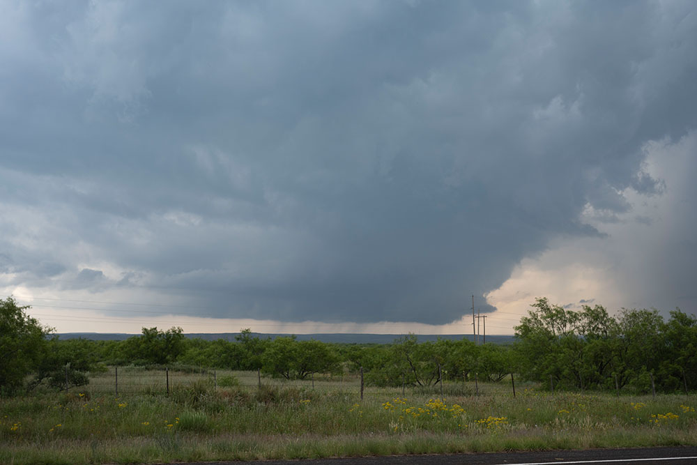 Bereits am frühen Nachmittag haben dort die ersten Gewitter ausgelöst, die beste Luftmasse mit guten Scherungswerten liegt allerdings in einem schmalen Bereich entlang der I40 von Santa Rosa bis nach Amarillo. Nach einigen Stunden des Wartens zeigen sich erste Reflektivitätssignale im Bereich von Vaughn, südwestlich von Santa Rosa. Als sich die Zelle verstärkt, fahren wir sie an:
