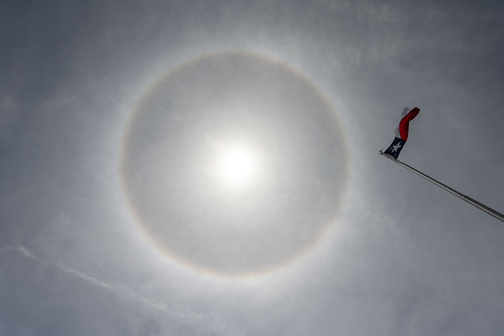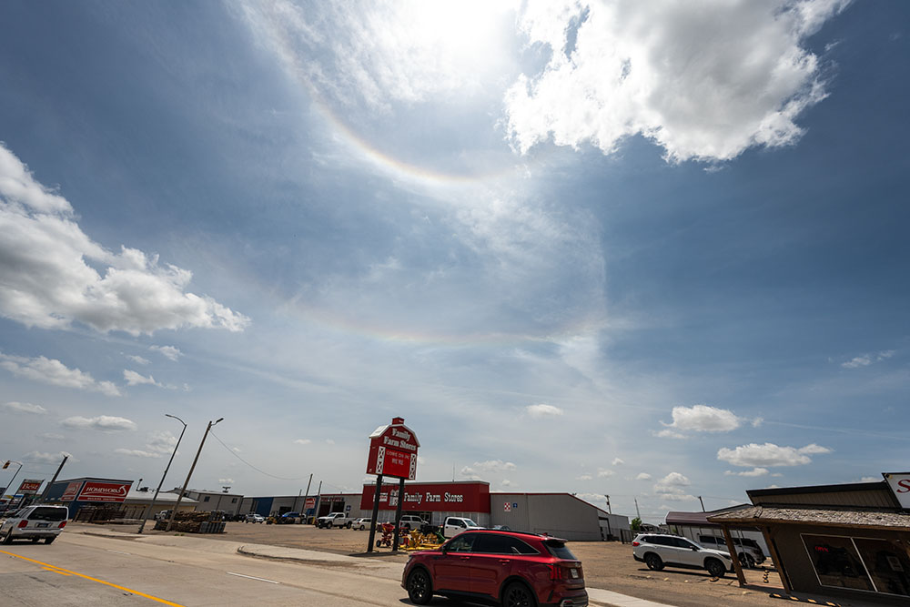 Weiter ging es Richtung Norden durch bekannte Ortschaften, die man so gut wie bei jeder Chasingtour durchfährt, z.B. Dumas. Dort gab es das nächste Highlight. Einen quasi vollständigen Zirkumhorizontalbogen bei 72° Sonnenhöhe, welchen man generell nur bei Sonnenhöhen über 57,8° sehen kann. In Deutschland nur im Hochsommer zur Mittagszeit, dann meist in homöopathischer Helligkeit. Seitlich davon zeigen sich noch schwach die Infralateralbögen. Ein toller Anblick.