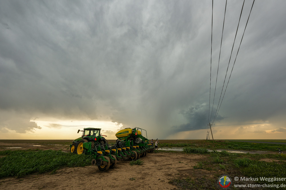 Aber wir sind ja zum Chasen hier, also nochmal vollgetankt am Dreh- und Angelpunkt Stratford und dann ging es auch schon los. Erste Gewitter lösen im Oklahoma Panhandle aus, die besser Luftmasse liegt aber weiter nordöstlich in einem Streifen quer durch Kansas bis Oklahoma. Wir lassen sie links liegen und fahren weiter. Die erste von vielen Entscheidungen des Tages. Im südwestlichsten Kansas rund um Johnson City haben mittlerweile weitere Gewitter ausgelöst. Es ist 16 Uhr Ortszeit und wir fahren die zu dem Zeitpunkt vielversprechendste Entwicklung an. Die Sicht ist sehr gut, sodass wir die Basis bereits aus 30 Meilen Entfernung sehen können. Als zwei Zellen mergen zeigt sich plötzlich eine trichterförmige Absenkung in der Ferne. Tornado!